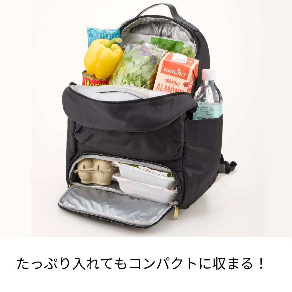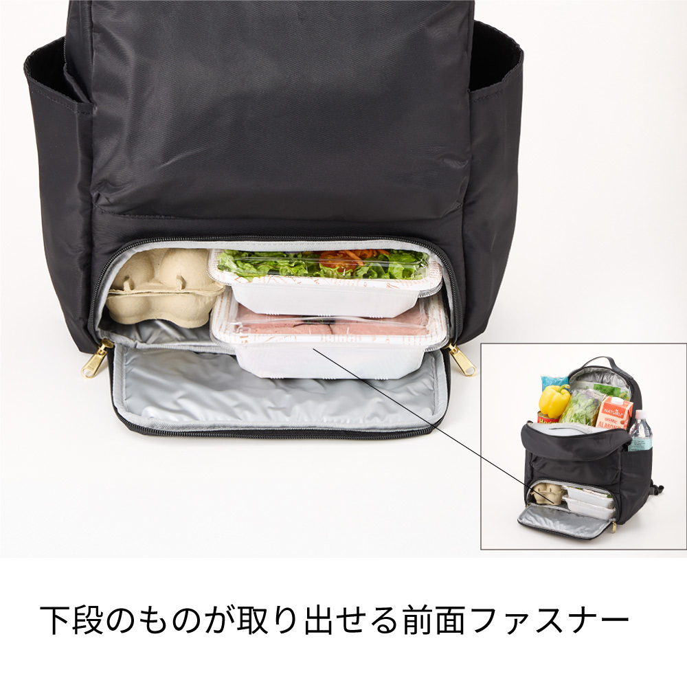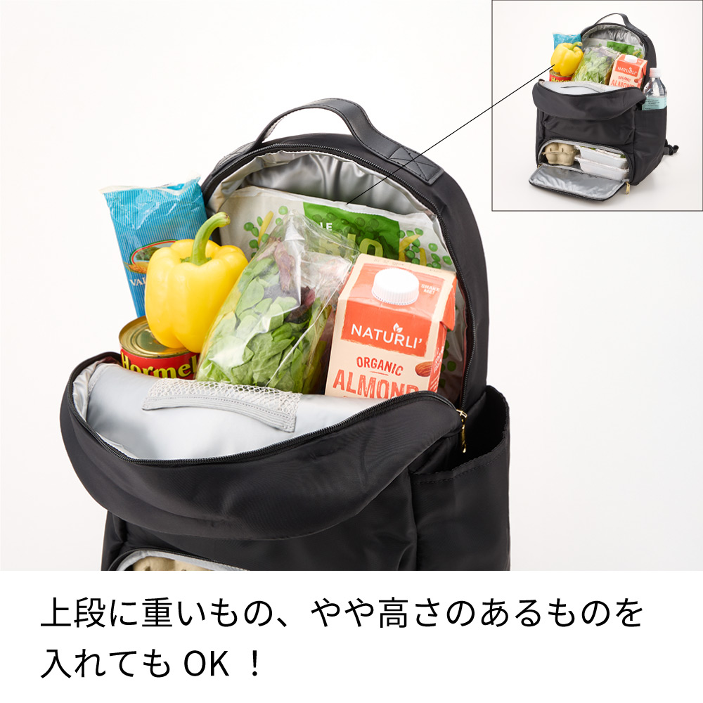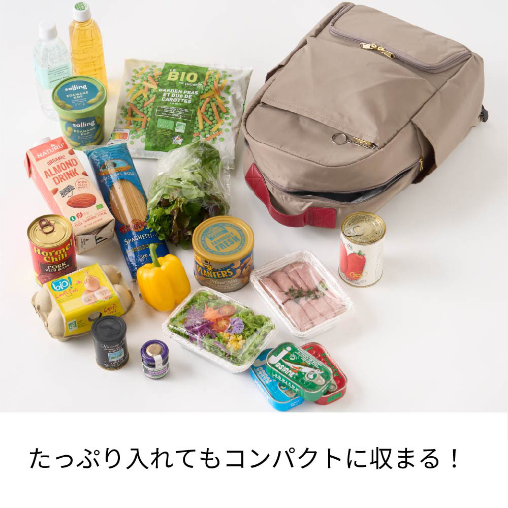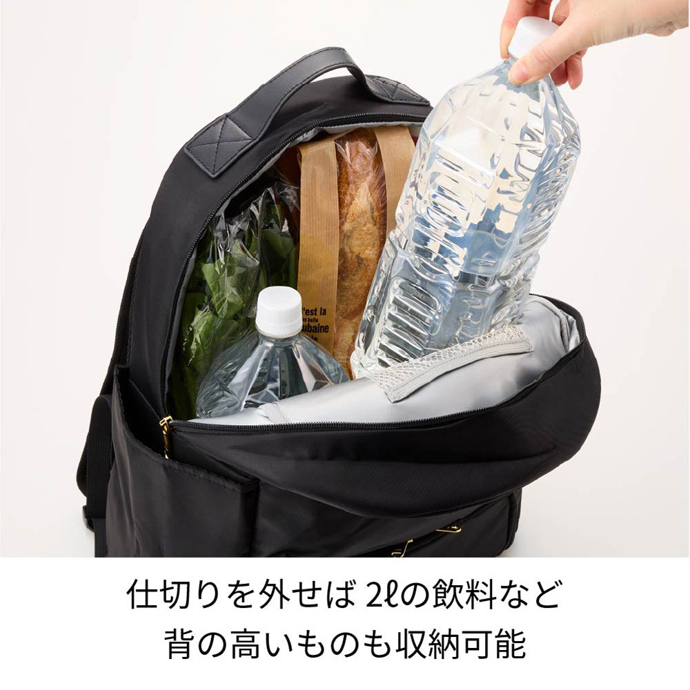 仕分けと出し入れがしやすい保温保冷リュックで、日々の買い物がラクになる!レジ袋が有料化されてから、今やマイバッグの持参は当たり前。とはいえ、普通のマイバッグだけだと、夏場は生鮮食品や冷凍食品の持ち歩きが気になるし、潰したくないものは別にしておきたいし…。たくさん買い物をした時は、トートバックタイプだと体の一方に重さが偏って疲れる…。などなど、お買い物のストレスは尽きませんよね。そんな毎日を快適にしてくれるのが、この「仕分けと出し入れが便利な保温保冷リュック」です。内側にあるフラップで、上と下の2段に。面ファスナーで取り外しも簡単。内側は、面ファスナーで取り付けられるフラップで縦方向2段に仕切れます。下の段は前面のファスナーを開いて取り出すことが可能。この構造により、潰れて欲しくない食材、濡れて欲しくないものを分けて収納でき、入れる順番を気にすることなく、パッと袋詰めが完了します。意外と時間のかかるスーパーでの袋詰め作業を時短し、ストレスも軽減!上段に重いもの、やや高さのあるものを入れてもOK!フラップはしっかりとした面ファスナーでくっついているので、上段部分に牛乳パックなどを入れてもOK。やや高さのある食材は、上段に入れるのがおすすめ。下段のものが取り出せる前面ファスナー仕切った下段部分には、トレーに入った生鮮食品類、パックのお惣菜などを。幅を取ってじゃまになりがちだけれど、横にもしたくない、潰したくない。そんな食材を入れるのに最適です。前面のファスナーを開けば、下段のものだけを取り出せます。たっぷり入れてもコンパクトに収まる!リュックの収納容量は約20L。いつもの買い物にもしっかり対応できる容量だから、コンパクトなのにこれだけの食材が入ります。仕切りを外せば2Lの飲料など、背の高いものも収納可能仕切りとなるフラップを外せば、2Lボトルの飲料やバゲットなど、背の高いものも入ります。内側にはシルバーコーティング仕様内側はシルバーコーティングを施しているので、夏場の暑い中、持ち帰るまでの温度変化が気になる生鮮食品や、お惣菜なども安心です。※保冷剤をお使いいただき、生ものの長時間の持ち歩きや外に放置はしないようにしてください。保冷剤を入れられるメッシュポケット付き内側にはお手持ちの保冷剤を入れておくことができるメッシュポケットも。ピクニックでお弁当を持っていく時などに便利。スマホや財布を入れるのに便利な背面ポケット背面部にもファスナーポケット付き。お財布やスマホなどをここに入れておけば、買ったものを取り出さなくても、必要な時にサッと取り出せます。500mlペットボトルや折りたたみ傘を入れられるサイドポケット両サイドには、500mlのペットボトルが入るポケットがあるので、暑い夏場も水分補給対策をしてお買い物に行けます。また急なゲリラ豪雨に備えて、もう片方のポケットには折り畳みの傘を入れておくのもおすすめです。もちろん、買い物で購入した飲料や食材をここに入れても◎。