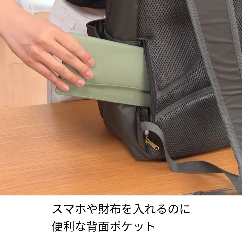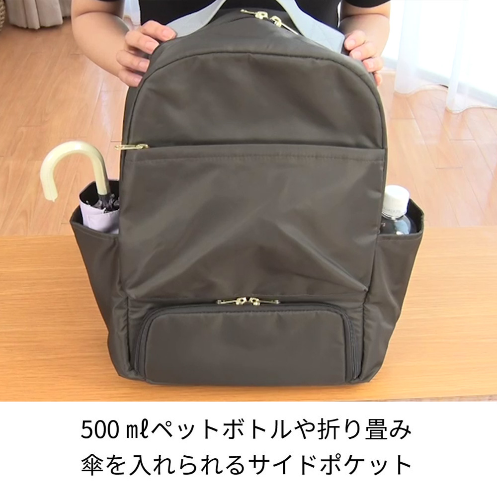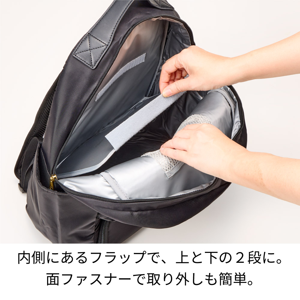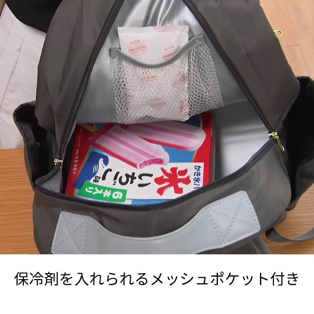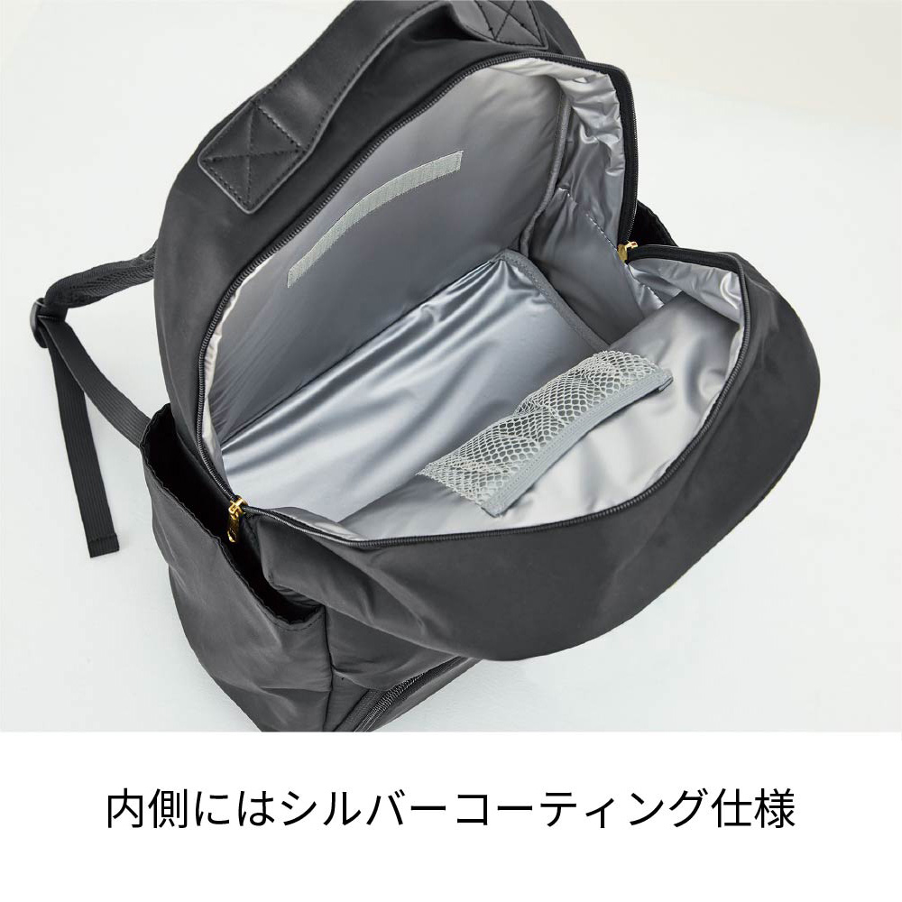 仕分けと出し入れがしやすい保温保冷リュックで、日々の買い物がラクになる!レジ袋が有料化されてから、今やマイバッグの持参は当たり前。とはいえ、普通のマイバッグだけだと、夏場は生鮮食品や冷凍食品の持ち歩きが気になるし、潰したくないものは別にしておきたいし…。たくさん買い物をした時は、トートバックタイプだと体の一方に重さが偏って疲れる…。などなど、お買い物のストレスは尽きませんよね。そんな毎日を快適にしてくれるのが、この「仕分けと出し入れが便利な保温保冷リュック」です。内側にあるフラップで、上と下の2段に。面ファスナーで取り外しも簡単。内側は、面ファスナーで取り付けられるフラップで縦方向2段に仕切れます。下の段は前面のファスナーを開いて取り出すことが可能。この構造により、潰れて欲しくない食材、濡れて欲しくないものを分けて収納でき、入れる順番を気にすることなく、パッと袋詰めが完了します。意外と時間のかかるスーパーでの袋詰め作業を時短し、ストレスも軽減!上段に重いもの、やや高さのあるものを入れてもOK!フラップはしっかりとした面ファスナーでくっついているので、上段部分に牛乳パックなどを入れてもOK。やや高さのある食材は、上段に入れるのがおすすめ。下段のものが取り出せる前面ファスナー仕切った下段部分には、トレーに入った生鮮食品類、パックのお惣菜などを。幅を取ってじゃまになりがちだけれど、横にもしたくない、潰したくない。そんな食材を入れるのに最適です。前面のファスナーを開けば、下段のものだけを取り出せます。たっぷり入れてもコンパクトに収まる!リュックの収納容量は約20L。いつもの買い物にもしっかり対応できる容量だから、コンパクトなのにこれだけの食材が入ります。仕切りを外せば2Lの飲料など、背の高いものも収納可能仕切りとなるフラップを外せば、2Lボトルの飲料やバゲットなど、背の高いものも入ります。内側にはシルバーコーティング仕様内側はシルバーコーティングを施しているので、夏場の暑い中、持ち帰るまでの温度変化が気になる生鮮食品や、お惣菜なども安心です。※保冷剤をお使いいただき、生ものの長時間の持ち歩きや外に放置はしないようにしてください。保冷剤を入れられるメッシュポケット付き内側にはお手持ちの保冷剤を入れておくことができるメッシュポケットも。ピクニックでお弁当を持っていく時などに便利。スマホや財布を入れるのに便利な背面ポケット背面部にもファスナーポケット付き。お財布やスマホなどをここに入れておけば、買ったものを取り出さなくても、必要な時にサッと取り出せます。500mlペットボトルや折りたたみ傘を入れられるサイドポケット両サイドには、500mlのペットボトルが入るポケットがあるので、暑い夏場も水分補給対策をしてお買い物に行けます。また急なゲリラ豪雨に備えて、もう片方のポケットには折り畳みの傘を入れておくのもおすすめです。もちろん、買い物で購入した飲料や食材をここに入れても◎。