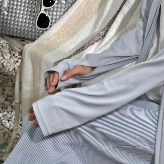 親指が通せる指先部分はオープンな仕様に。スマートフォンや手元の作業を邪魔することなく、手の甲まで紫外線対策!自転車や車の運転時にも嬉しい。