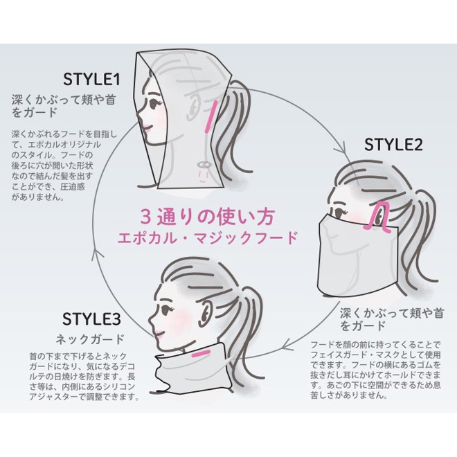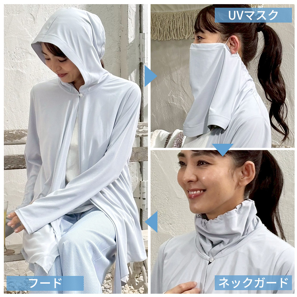UVカット率95%以上+着た瞬間ひんやり!暑い夏を快適に過ごす工夫が詰まったUV&近赤外線カットカーディガン日焼け対策+猛暑対策なら、この一枚!夏でも快適・オシャレに「紫外線」から肌をガード!太陽光のうち紫外線よりも多く含まれていて、肌ダメージを引き起こすと話題の「近赤外線」までカットします。暑い夏を快適に過ごす!UVカット率95%以上+着た瞬間ひんやり繊維専門商社・瀧定名古屋が5年かけて開発した「トゥルーボーテ」という日本製生地を採用。・紫外線遮蔽率…クールネイビー:98%以上、アイスグレージュ:97%以上、ミストブルー:95%以上・UPF…クールネイビー:50+、アイスグレージュ:50+、ミストブルー:35(※50+ はUPFの最高格付け値です)・近赤外線遮蔽率…81%以上・接触冷感…着た瞬間ひんやり。・吸水速乾…汗や水で濡れても乾きやすい。・遮熱加工…日差しを遮って、服の中の温度が上がるのを防ぎます。肌ダメージの原因と話題の近赤外線までカット!太陽光のうち、「紫外線」よりも約7倍多く含まれる「近赤外線」。この近赤外線は肌の深部まで届き、シワやたるみなどの肌ダメージを引き起こすと言われています。こちらは紫外線を反射する「酸化チタン」と、近赤外線を吸収する「レアメタル」を練り込んだ糸で編まれた特殊生地を使用し、紫外線と近赤外線を両方カット!「マジックフード」日傘・UVマスク・ストールの役割も一枚で!フード:サッと被るだけで帽子や日傘の役割に。深めに被れるので顔までしっかりガードしてくれます。後ろからポニーテールが出せるので、髪が長い方でも快適。UVマスク:フードの両脇に入っているゴムを耳を引っ掛ければ、マスクみたいに顔をすっぽり隠せちゃう!下が開いてるからマスクよりも呼吸しやすい。ネックガード:首元まで下げれば、ストール代わりのネックガードに!日常もレジャーもこれ一枚でOK!(1)ドレープデザイン…前下がりのデザインから生まれるドレープで、縦ラインが強調されてスラッと見える!(2)お尻が隠れる長め丈…気になるお尻周りもカバー。(3)貝調ボタン…カジュアルになりがちなファスナーではなく、ボタン一つ留めに。胴体部分に風が抜けて涼しく着られる仕様です。(4)アームカバー…親指が通せる指先部分はオープンな仕様に。(5)サイドポケット…スマホがすっぽり入るサイズの右片側ポケット付き。(6)コンパクトに収納可能…コンパクトに折り畳んでバッグに仕舞えます。フード部分のゴムでまとめれば、持ち運びも便利!「UVカット透明フェイスガード」と一緒に着用もオススメ別売りでUVカット率99%の顔から首まで守れるフェイスガードもご用意!一緒に着用するとさらに対策バッチリ。「まとう熱疲労対策(R)」を掲げるEPOCHAL/エポカル“着るだけ”で紫外線・熱中症対策ができる「エポカル」は、紫外線対策ウェアの専門ブランド。アトピーのわが子のために専業主婦の母親が23年前に設立。当時UVカットウェアは市場では見つけられず、90cmサイズのパーカー作りから始めて今では子供から大人まで、国内外で展開するまでに成長しています。