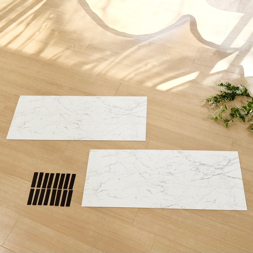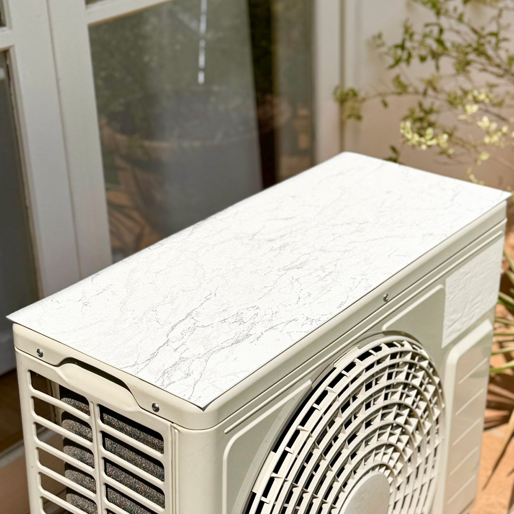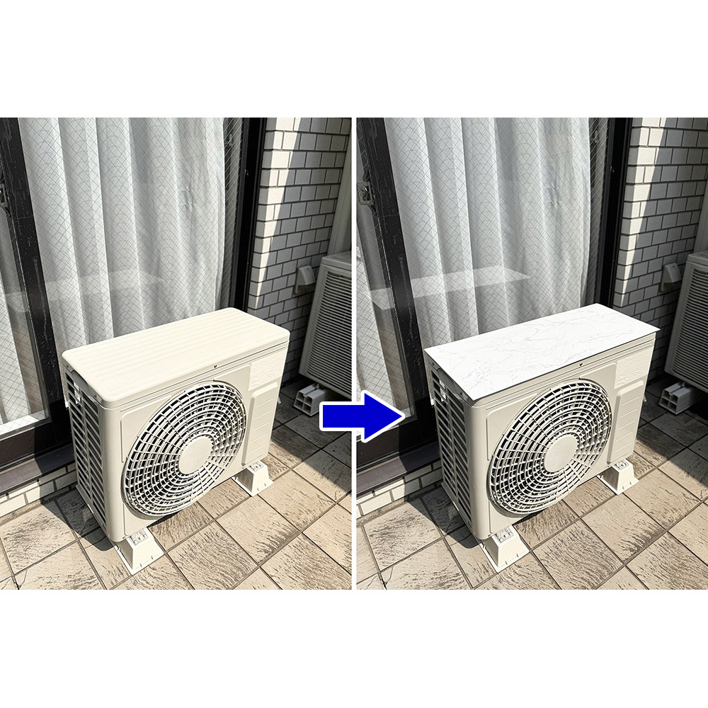 真夏のお助けアイテム!見た目もオシャレなマグネット式の遮熱シート。室外機の上に置くだけで手軽に夏の強い日差しをカット!室外機の表面温度の上昇を抑えることで、冷房運転中の室外機の負担軽減が期待できます!―エアコンを効率よく使うコツ―知ってましたか?実はエアコンの室外機に直射日光が当たって高温になると、室外機内部の熱を外へ逃がす効率を妨げ部屋が冷えにくくなると言われているんです。つまりエアコンを効率よく使うコツは“室外機を直射日光から守ること”!最大のポイント「のせるだけで室外機上部からの温度上昇を抑える!!」最近エアコンの効きが悪いな〜なんてことありませんか?もしかしたら、直射日光が当たり続ける室外機が原因かも!そこで!室外機の上にのせるだけで室外機の天面からの温度上昇をおさえてくれる便利グッズがオススメ!遮熱材を混ぜた樹脂シートを4層構造に成形。だから夏場の直射日光に対する遮熱効果が期待できるんです。しかも室外機の上にのせるだけから、室外機の排気を遮ることもないので効率的!取り付けも超簡単!付属のマグネットを裏面に貼って、あとは室外機の上に置くだけ!マグネットタイプだから、取り外しもラクラクです。サイズは奥行30cm×幅80cm。ハサミで好きなサイズにカットも出来るのでお手持ちの室外機のサイズに合わせて取り付けができちゃうのも嬉しいポイント♪ディノスオリジナルのお洒落な大理石調♪何と言っても見た目がオシャレ!遮熱シートには見えない大理石調で、室外機の上に敷くだけで一気に華やかな印象になっちゃいます。嬉しい日本製!とにかく頑丈で長持ち!外に置く物だから、風で飛ばされないか心配ですよね?でも大丈夫!程よい重さもあって、付属のマグネットでピタッとくっついているから飛ばされる心配が少ないんです。しかも、防水仕様! 汚れた時はサッと拭けばOK!お手入れもラクラクです。