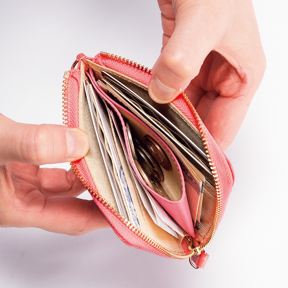 ◎コンパクトサイズでもL字ファスナーで、ガバッと開き、見やすく、取り出しやすい。◎お札は2つに折って入れられます。◎中央部は小銭入れ。ファスナーなしでも小銭がこぼれ落ちず、出し入れラク。