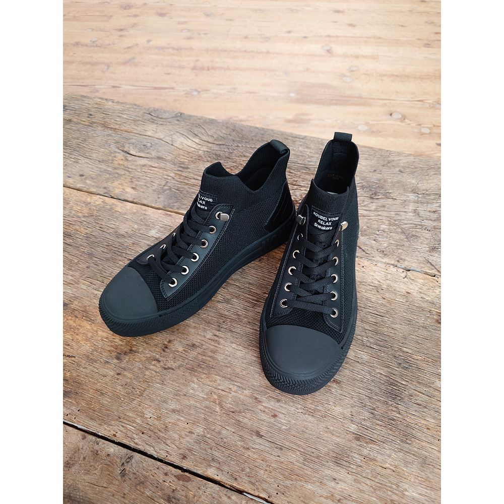 ラクなのにおしゃれ!と人気のスニーカーのメンズタイプ!ハイカットデザインなのに 脱ぎ履きがラク!厚底で脚長効果も♪ オールブラック、オフホワイト、ブルーグレーの 3色。