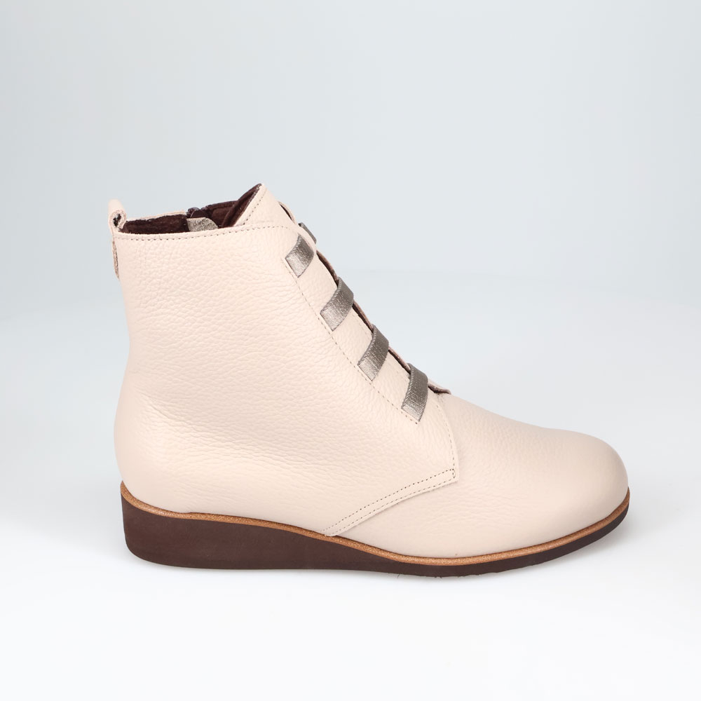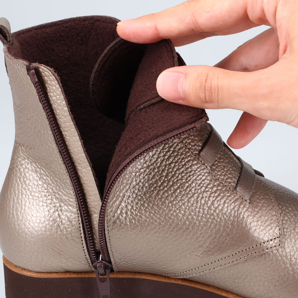 『フィグリーノ』ファン必見!牛革なのに柔らかく軽いブーツのミドル丈モデル!履き心地がよくて人気のフィグリーノからミドル丈ブーツが登場!暖かなブーツはおしゃれに履きたいですね。でもブーツって、意外に履きづらい…。特に牛革は、重くて疲れるし、締めつけられて窮屈。そこでご紹介したいのが『フィグリーノ ミドル丈レザーブーツ』。牛革なのに、軽く、やわらかく、まるでスニーカーのような履き心地。おしゃれなのにカッチリし過ぎないからカジュアルにも合わせやすく、毎日活躍します。さらに待望のミドル丈仕様に。『フィグリーノ ミドル丈レザーブーツ』のポイントは3つ(1)とにかく履き心地がいい!(2)疲れにくい!(3)さまざまなファッションに似合う!【こだわりの牛革】◎「牛革なのに履き心地がいい!」その秘密は牛革に…。高い技術を持つ兵庫県たつの市のタンナーがフィグリーノのために独自開発した日本製の牛革を使用。しっかりとした強度を保ちながら、やわらかく、しなやかで、心地よく足にフィット。足の指が自由に動くほどラクチンです。◎通常より多い18工程かけてやわらかく!通常の革は完成までに12工程。ところが今回の牛革はなんと18工程もかけました。職人が1枚1枚、丁寧に伸ばして、揉んで、手間暇かけることで、ここまで軽く、やわらかく、しなやかに仕上がりました。【靴づくりも丁寧な手作業で!】◎大量生産できないこだわりの作りやわらかな牛革を靴に仕立てたのは神戸の熟練の靴職人。手作業で1足1足、丁寧に作っているため、締めつけ感の少ない、包み込まれるような履き心地。★〈軽い〉牛革なのに、重さは片足たった約245g(23.5cm)!重たいブーツだと片足500g以上あるものもあり、この軽さは本当に嬉しい!★〈足にフィット〉革のブーツは馴染むまでに時間がかかるのが悩みですが、これなら届いた日から足にフィット。ブーツが足に合わせてくれる感覚です。★〈甲高・幅広・外反母趾の方にも〉革がやわらかいから、お悩み足にはもちろん、硬いレザーブーツで靴ずれをしたことのある方にもおすすめです。★〈ゴム仕様〉靴ヒモ部分がゴム仕様なのもラクチン!締め付け感が少なく、快適なんです。★〈サイドファスナー付き〉ファスナー付きだから脱ぎ履きスムーズ。「疲れにくい!」のもフィグリーノの魅力!履いて、歩くと、衝撃を感じさせず、歩行がスムーズ。弾力のあるソールで、1日中履いていても疲れにくい!こんなに気持ちよく履けるブーツは、見つけにくいですよ。★〈インソール〉体重のかかるインソールには高反発素材を採用。着地の衝撃を吸収して軽減します。★〈靴底〉靴底がやわらかく、屈曲性が良いのも疲れにくい理由。スリットが入ったソールを使用することで、自由自在に曲がり、足の動きにフィット。ムダな力が入らず、疲れにくいんです。カッチリし過ぎず、カジュアルでもおしゃれ!牛革ならではのきちんと感があるから、カジュアルからエレガントまで大人の女性にピッタリ!エレガントなワンピースやワイドパンツから普段のデニムまで、お手持ちの洋服に合わせやすい。★〈内側フリースであったか!〉寒い時期に履くブーツだけに、内側にぐるっとフリース素材を使用。中敷きまでフリース素材だから暖かいんです