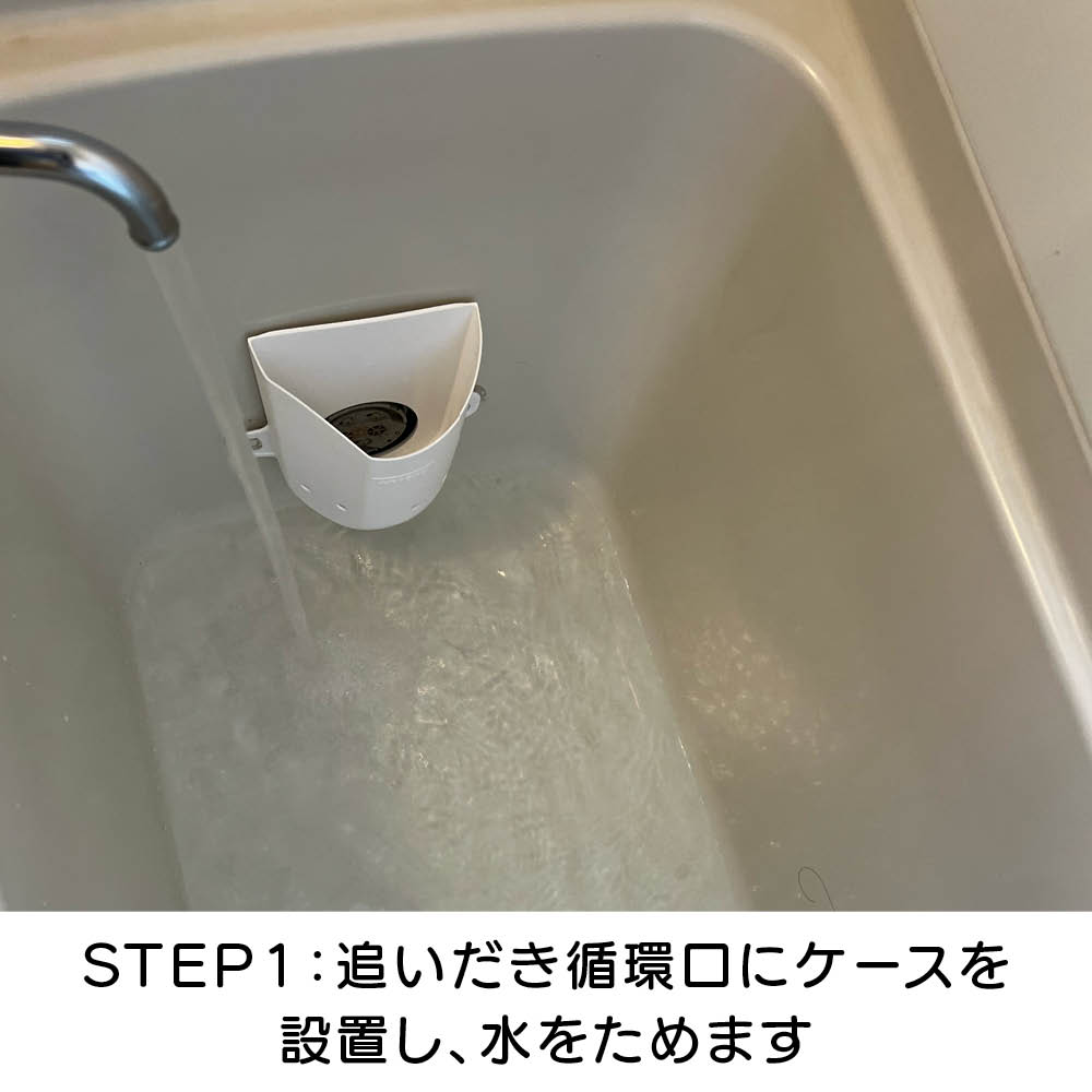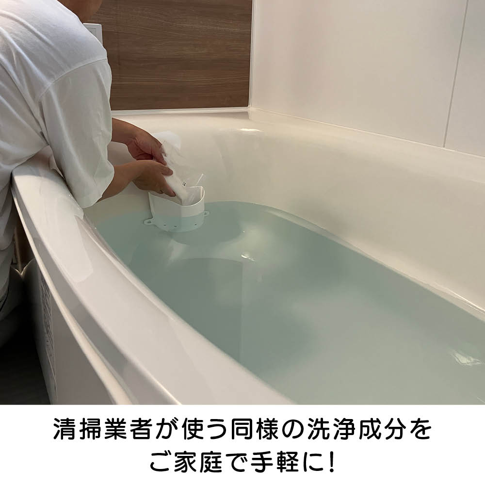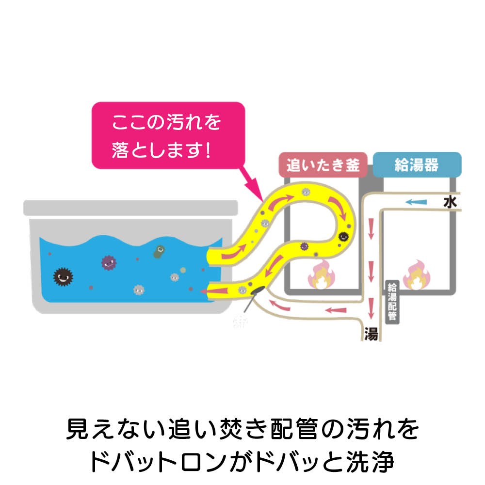 フジテレビ『いいものプレミアム』で放送 お風呂の配管汚れが気になるけれど、業者に頼むと高そうだし…そんなお悩みを「ドバットロン」が解決!洗浄と発泡のW効果と独自構造の専用ケースが、薬剤を直接配管へ高濃度で送り込み、奥に潜む汚れや菌までドバッと除去。プロ仕様の洗浄力をぜひご家庭でお試しください。洗浄と発泡のWのチカラ。汚れを分解&泡で押し出す、圧巻の洗浄力A剤が汚れに「浸透」、B剤の発泡パワーが汚れや菌を勢いよく「押し出す」。Wの効果で、配管の奥深くに潜む汚れを浮き上がらせて、ごっそり取り去ります。驚きの洗浄力を、ぜひご自宅でお確かめください。見えない追い焚き配管の汚れをドバットロンがドバッと洗浄普段の掃除では手が届かない配管内部は、水垢や皮脂、雑菌の温床に。ドバットロンが、配管の内側の汚れをしっかり洗浄し、毎日使うお風呂を清潔で気持ちのよい空間に保ちます。従来品とはココが違う!配管の奥へ〜独自設計高濃度の薬剤を「トルネードケース」で溶かし、直接配管へ送り込む独自設計。浴槽にためたお湯全体に薬剤を拡散する従来品とは異なり、配管の汚れにピンポイントでアプローチします。※メーカー従来品の風呂釜洗浄剤に要する水量は120〜150L(追い焚き時)配管掃除はドバットロンにお任せ。こすらず、触らず、手間なく簡単洗浄手を汚さずに掃除できる手軽さも大きな魅力。トルネードケースを設置し、薬剤を入れて追いだきするだけ。ケース内部で薬剤が自動的に混ざる構造なので、最後まで汚れに触れずに配管掃除が完了します。その名の通り、渦を起こして薬剤を溶かすトルネードケースドバットロンの大きな特徴の一つが、独自設計の「トルネードケース」。角度を工夫することで生まれる水流で薬剤を溶かし、高濃度のまま配管へ直接送り込む構造により、優れた洗浄力を実現しました。実際にハウスクリーニング業者が使用する洗浄剤と同じ成分を配合。プロ品質の洗浄力をご家庭でも実感でき、配管の奥の汚れや菌もしっかり落とせます。「プロの現場ではとにかく時短で効果がある事が大事なんです。高濃度の液が直接配管に届いて洗浄してくれますし、また同時に除菌もしてくれるのでお客様に自信をもってお勧めできる商品です。」──株式会社グリーンデイズ 木村氏STEP7終了後水を循環アダプターの3cm上までため、追いだきをし、排水する。※洗浄時に付着した汚れを放置すると、汚れの色が浴槽に移る場合があります。汚れが浴槽に残る場合は、スポンジ等でこするなど、しっかりと洗い流してください。最後にフィルターを取り付けて終了。設定温度を元に戻す。(通常入浴時の温度)※汚れが出なくなるまで繰り返してください。