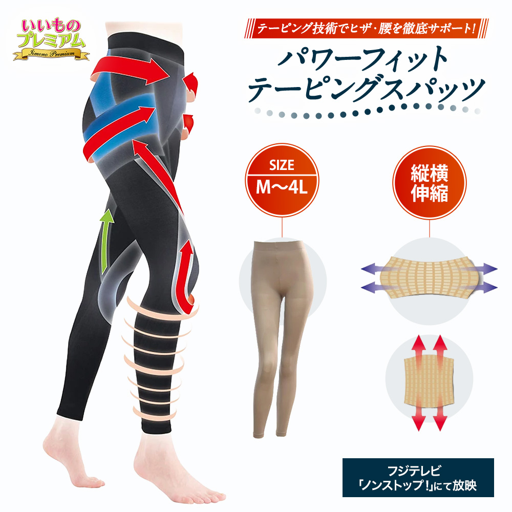 フジテレビ『いいものプレミアム』で放送テーピングの発想で、はけば下半身をぐっとサポート!ヒザ・腰を支えて階段もラクにテーピング技術でヒザ・腰を徹底サポート!はけばウォーキング・階段の上り下りもラクにトップアスリート指導も行うボディトレーナー監修!プロの「テーピング」理論をスパッツに落とし込み、はくだけでヒザ・腰をしっかりサポートします。下半身が安定しやすく、ウォーキングや階段の上り下りなど、日常生活の動作もラクに!【テーピングとは…】弱った筋肉の代わりになるもの!ヒザのグラつきや腰の不調の主な原因は、筋肉の衰え。実は筋肉量の減少は20代から始まり、特に下半身の筋肉は上半身よりも早く衰えていくとも言われています。そこで活用されているのが「テーピング」!テーピングは弱った筋肉の代わりになるもので、スポーツ選手のケガ予防・保護に使用されてきましたが、実は年齢と共に衰えを感じるヒザ・腰の補強にも有効です。衰えた筋肉の代わりに関節を支えつつ、体の動きをサポートする役割があります。そんなテーピングの特性を、特殊な編み方で再現しました。※イメージ【サポート力がスゴイ!(1)】ヒザのサポート「ヒザがグラつく」「踏ん張れない」「下りの階段がこわい」骨盤から伸びたラインが、ヒザを囲うようにグラつきをしっかりサポート。さらに、ひざを捕まえて上に向かって引き上げてくれるので、脚上げもスムーズに!階段の上り下りの不安も感じにくくなります。【サポート力がスゴイ!(2)】内もものサポート歩くときヒザが外に開いていると、関節がねじれやすく、負担や違和感の原因になることも。内ももに配したサポートラインが脚を内側に引き寄せ、真っ直ぐな歩行に導く!脚を前へ運びやすくなり、歩くたびに安定感と軽やかさを感じられます。【サポート力がスゴイ!(3)】腰まわりのサポート身体の真ん中で土台となるのが、骨盤。前後からグッと締めながら支えることで、腰が安定して動きやすく!さらに骨盤がしっかり支えられることで、股関節の動きもなめらかに。歩幅を広くとって、スムーズな歩行に。【はき心地も快適!】縦に伸び止まり、横にしっかり伸びる!特殊な編み方で、部位ごとに伸び幅を緻密に調整しています。しっかり支えるため、テーピングライン部分は縦に伸び止まる設計に。この伸び止まり幅は、実際のテーピングテープの特性を編み方で再現!同時に、横方向には伸びやすい設計にすることで、サポート力と脱ぎ着のラクさを両立しました。※イメージ【ふくらはぎもスッキリ!】段階着圧でラクなはき心地足首からふくらはぎにかけて、段階的な着圧設計に。長時間歩いたり、立ち姿勢が続く方にもおすすめです。