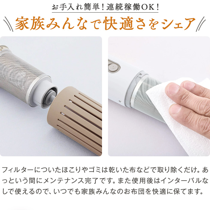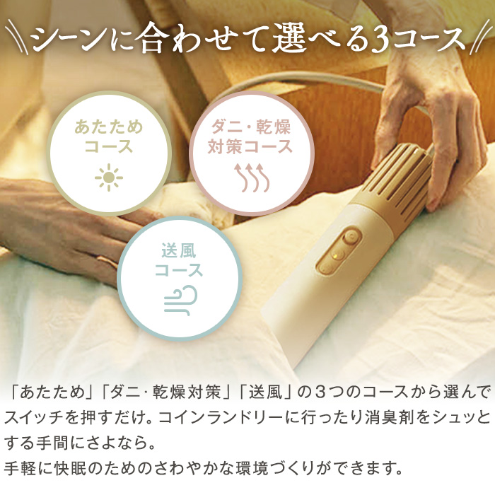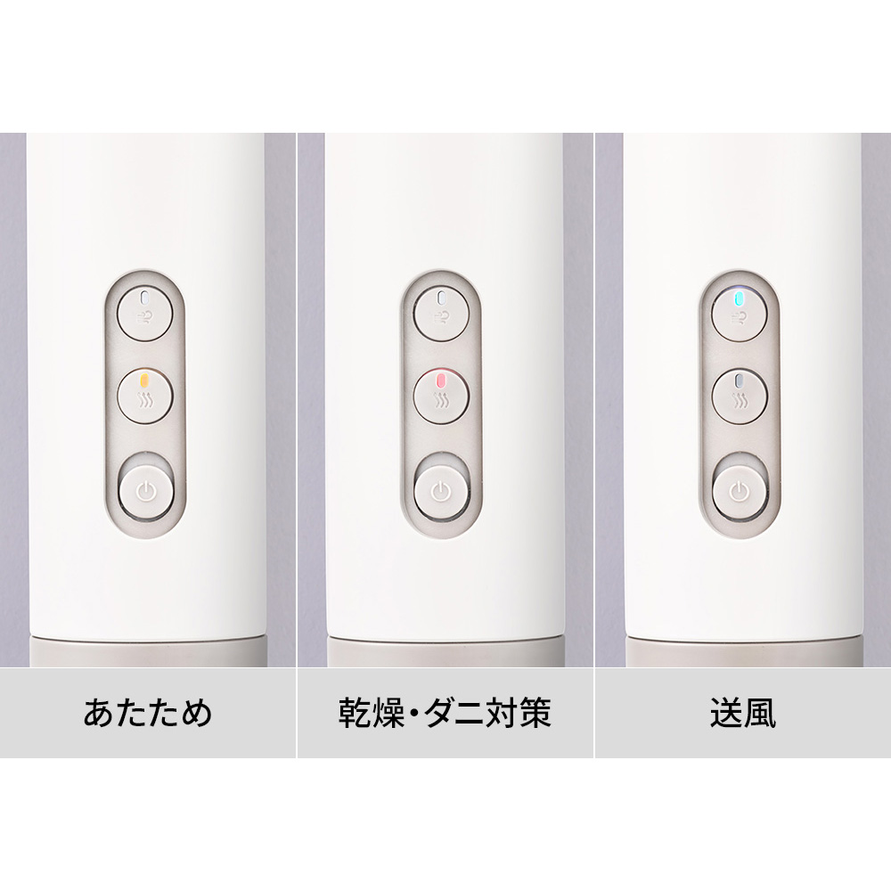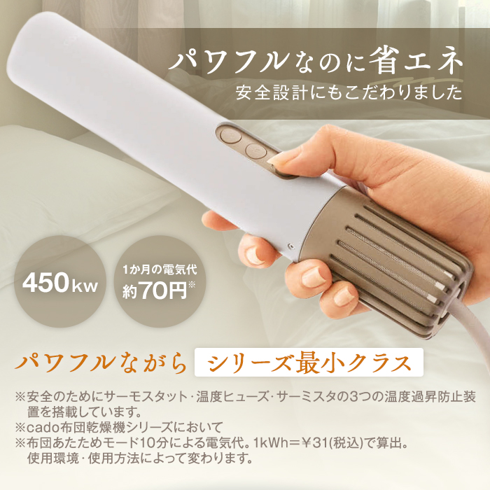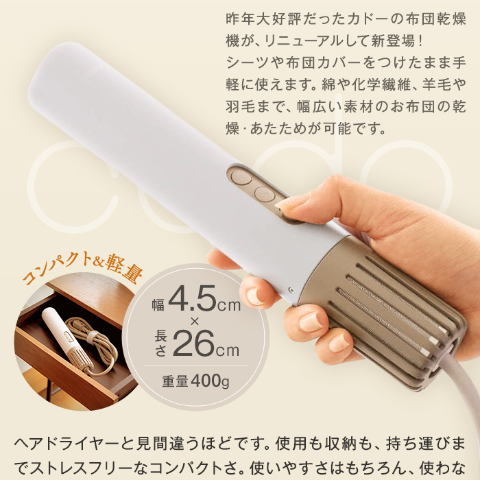 フジテレビ『いいものプレミアム』で放送サッとお布団に差し込むだけでお布団をホカホカ、フカフカに。コンパクトなのに大風量でパワフルな布団乾燥機コンパクトなのにパワフル温風の布団乾燥機で、毎日ホッコリ眠りませんか?ひんやり、ジメッとした布団ではなかなか寝つけない、、。そんな時に便利なのが布団乾燥機ですが、大きい、重い、設置が面倒などで使わなくなることも…。そこでおすすめなのが、『cado/カドー 超コンパクト布団乾燥機LITE』。サッと布団に差し込んで、スイッチを押すだけ。面倒な手間は一切なし!約10分でふかふかであたたかい布団にしてくれます。このマットなホワイトカラーが買えるのはディノスだけ!布団を干すのは面倒だけど、布団乾燥機は面倒なイメージが、、、、。「冬、布団に入ってヒヤってした」「湿気で布団がジメジメしてる」なんて経験、ありませんか?大きくて重たい布団をベランダに干すのも一苦労。布団乾燥機を使ってみたいけど、一般的なものは布団にシート敷いて、ホース出して、終わったら布団乾燥機をしまって、、、面倒なイメージがありますよね。わずか400gでとっても軽い!差し込むだけで布団をホカホカに暖めてくれる!なんとこの布団乾燥機、重さわずか約400gでとにかく軽い!使い方も簡単!布団に差し込み、電源スイッチをスライドさせればOK。従来のシートを敷いたり、ホースを繋いだりの手間がなくセッティングがとにかくラク。コースを選ぶのもワンタッチで、持ち運びも手軽です。コンパクトなのにパワフル温風!パワフル大風量の秘密は、毎分約8.5万回転の強力なDCモーターを搭載しているから。このモーターが、内蔵ファンを高速回転させ、温風を遠くまで押し出します。だからこんなにコンパクトなのに、布団の隅々にまで温風が行き渡り足元までポカポカ。あたためモード(10分)で布団がホカホカに!布団あたためモード(10分)使用直後のお布団をサーモカメラで見て見ると、、、、!布団の中は隅々までホカホカに。布団の黄色い部分は約40℃以上、赤い部分は約50度以上になっています。※室温21℃湿度38%の室内で測定※環境によって結果は異なります。※ディノス調べシーズン・シーンに合わせて使える3つのコース 〈あたため〉約55℃/10分でふんわり、あったか!冬場、布団に入った時のヒヤッと感が苦手な方は、寝る前10分間のあたためコースが便利。歯磨きなどをする前にサッとセットすれば、素早く布団が温まり、気持ちよく寝入ることができそう。〈乾燥・ダニ対策〉約60℃/80分でカラッとふかふかに!人間は1晩にコップ1杯ほどの汗をかくといわれます。そんなジメジメ感が気になる布団が、まるで天日干ししたようにカラッとふかふかに。布団の中に枕も入れておけば、一気に乾燥できます。〈送風〉120分で布団も枕もスッキリさわやか暑い季節など温め過ぎたくない時は120分の送風コースでもお布団がスッキリします。コンパクトだから旅先、出張にも!持ち運びがもっと便利に。旅先や出張先のお布団にもお使い頂けます。※海外では使用できませんこんな方におすすめ□ベランダに布団が干せない。□布団が重くて、干すのが大変、面倒。□家族が汗っかきで、布団がジメッとしがち。□布団に入った時のひんやり感が苦手。□花粉や梅雨時も布団をカラッと乾燥させたい。□布団乾燥機を買ったものの面倒で使わなくなった。