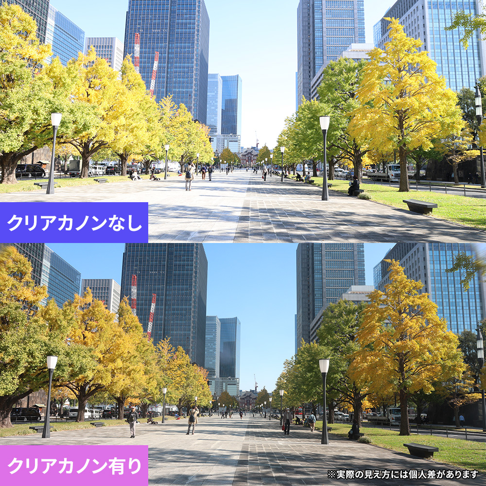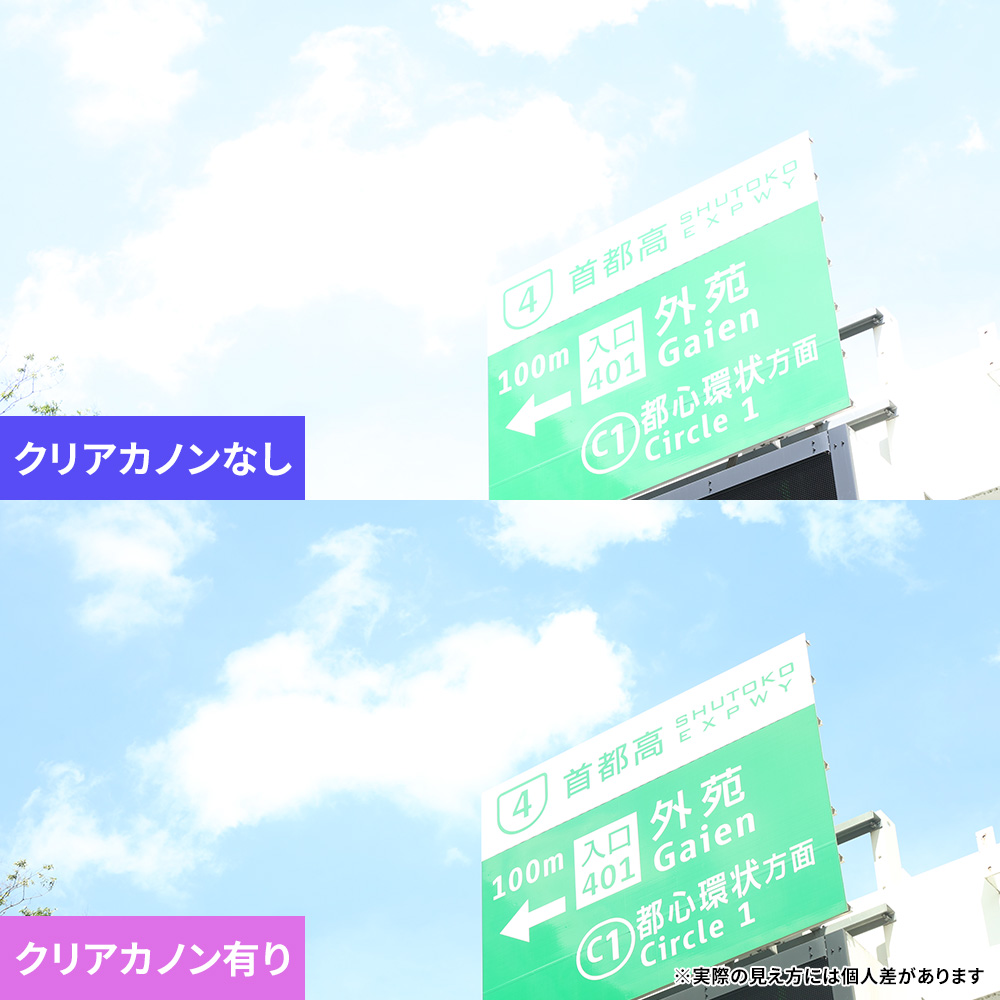 紫外線やブルー光線をカット!瞳の健康をサポートする“透明なサングラス”透明レンズなのに紫外線×ブルー光線をWでカット!アクセサリー感覚で着用できる大人気サングラス!1年中、紫外線から目を守る必要があるんです。紫外線対策は夏のイメージが強いですが、冬は太陽の位置が下がるため、太陽の光が目に入ってきやすいんです!歩いている時や運転中、冬でも太陽が眩しいと感じることありませんか…?太陽光には紫外線だけでなく、ブルー光線など目に有害な光が含まれており1年を通して目を守る必要があるんです。ゴールドベージュ着用透明なのに『紫外線』を99%以上カット!正面からは99%※1以上、裏側からの紫外線も95%※2以上カット!紫外線はあらゆるところで反射して、レンズの内側に差し込んでしまうことも。でもアイブレラクリアカノンなら、内側から目に差し込む紫外線もカット!前+裏、Wのカットで目をしっかり守ることができるのです。※1 紫外線透過率 ※2紫外線反射率 いずれも日本眼鏡普及光学器検査による目の疲れ・まぶしさの原因ともいわれる『ブルー光線』もカット!スマホやPC画面のイメージが強いブルー光線、実は太陽光や照明など様々な光にも含まれています。しかも、ブルー光線はまぶしく感じやすく、目の疲れの一因に。クリアカノンはまぶしさを和らげて目に優しいんです!眩しさを抑えてくれるので景色や道路標識もこの通り!くっきりハッキリ見えやすくなります。ライトグレー着用ゴールドベージュ着用どんな顔の形の方でも似合って、さらに小顔に見せてくれるデザイン!アイブレラクリアカノンは誰にでも馴染んで、似合いやすく、顔全体が小さく見えるこだわりのデザイン。■フレーム横の張り出し部分で顔の引き締め効果が!■レンズが縦に長いので視覚効果で顔全体が小さく。■丸みを帯びているのでどんな方にも溶け込む!太めの縁によって印象も若々しくしてくれます!かけていることを忘れさせるようなフィット感!輪郭問わずお顔にフィットしやすく、ズレにくい特殊な設計!1.鼻パッドは空気の入ったプニプニ素材を採用。鼻に跡が残りづらい!2.耳の後ろの滑り止めラバーで顔を動かしてもズレにくい。3.ツルの部分はバネを採用。お顔の幅を問わずフィットしやすい。■ピンクブラウン:気品のある可愛らしさを演出。肌馴染みの良いブラウンとピンクのカラーリング、素顔の上品さを引き立てるピンクゴールドメタル。■ゴールドベージュ:上品で柔らかい雰囲気に。抜け感ある柔らかいベージュと上品な印象を持たせるゴールドメタル。■ライトグレー:美しく洗練された印象に。透明感が美しいグレーとピンクゴールドメタル。