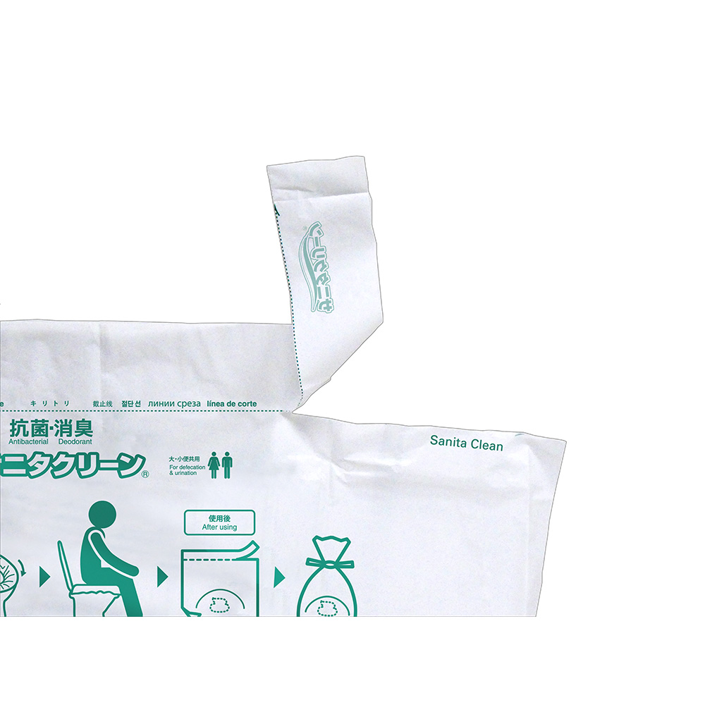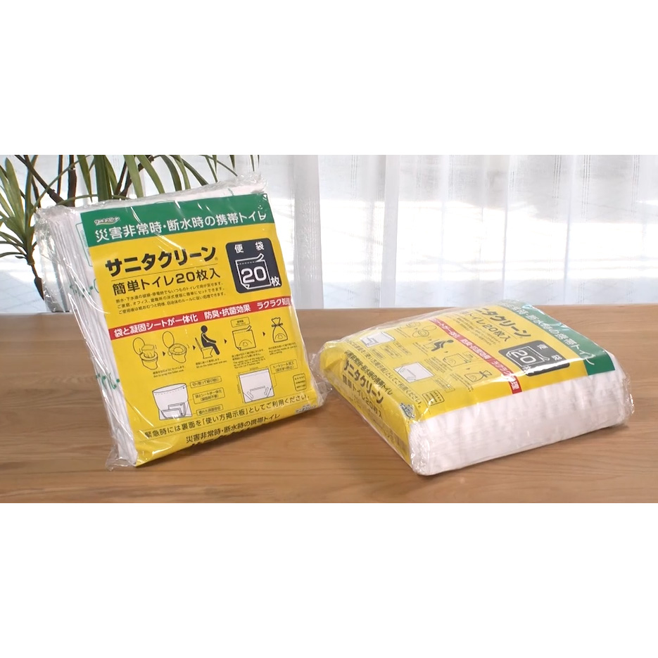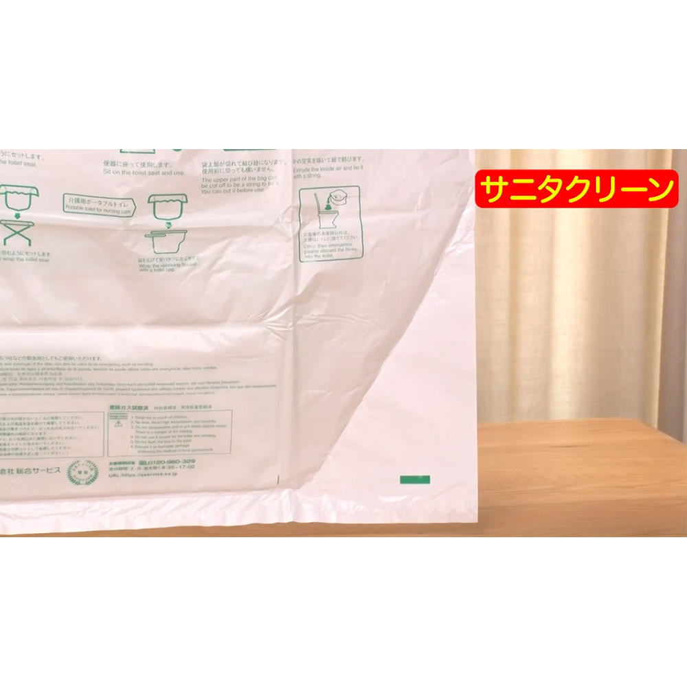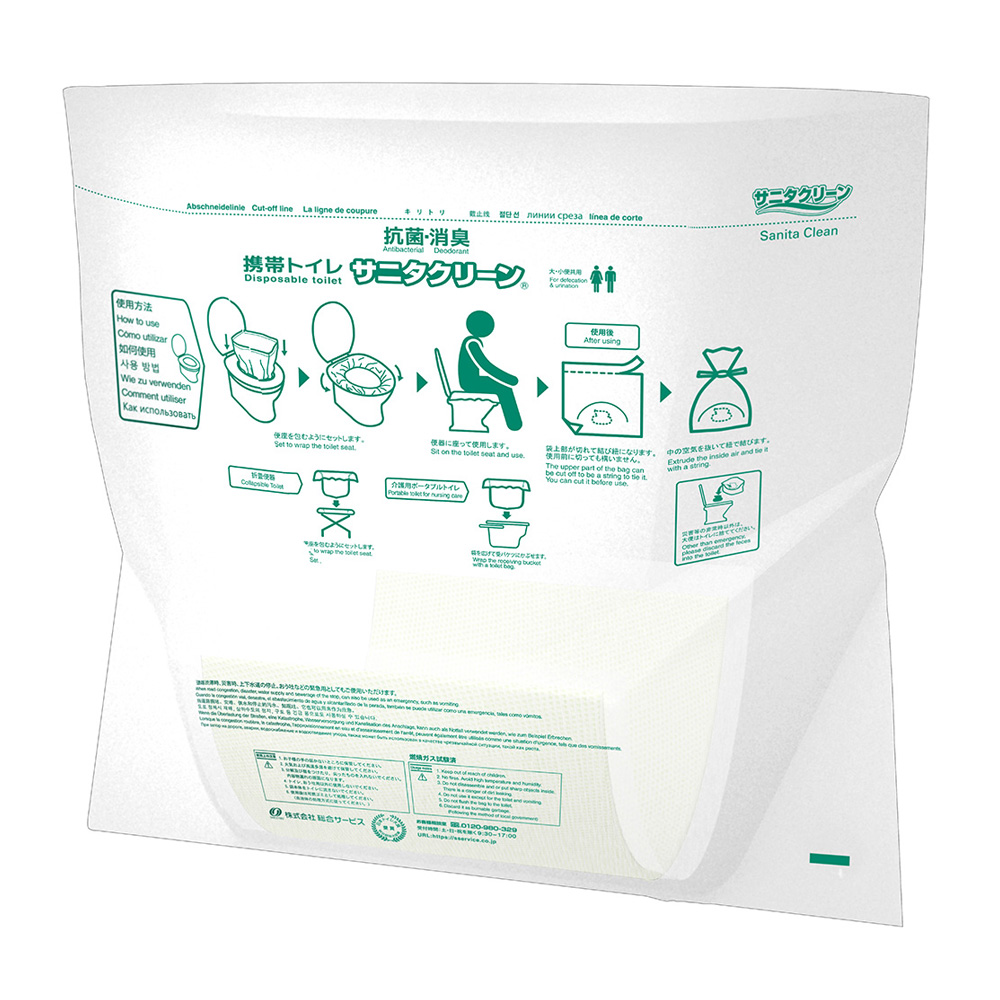 ※こちらでは2点以上購入の割引は対象外です。自宅のトイレに被せるだけ!非常用トイレに早変わり!自宅のトイレに被せるだけ!非常用トイレに早変わり!地震や停電などで、自宅のトイレが使えない時にオススメの非常用トイレのご紹介です。水や食料は備蓄していても、トイレの問題は忘れてしまいがちです。この「サニタクリーン」は、阪神淡路大震災をきっかけに誕生した非常用トイレで、実際に2024年1月に発生した能登半島地震でも避難所で活躍した実績があります。この機会に是非、備えることをおすすめいたします。一枚ずつ使い方が印字されているから誰でも簡単!分かりやすい!使い方は簡単です。袋を広げて便器に被せるだけでもう準備OK。用を足したら、袋を縛って、オムツと同じように可燃ごみとして処理できます。(※お住まいの自治体のルールをご確認ください)準備も片付けも超簡単なのが嬉しいポイント。袋と吸水シートが固定されているので、ズレてしまう心配がありません。誰でも簡単に使えるようにと、袋の中に吸水シートが内蔵されています。凝固剤はいりません。吸水シートが固定されているのでズレてしまったり、使い方を間違えてしまったりといった心配もなくお使いいただけます。袋を縛りやすいように、紐になるミシン目付き。用を足したら、袋の上部にあるミシン目に沿って破ってください。その部分が細長いビニール紐になりますのでそのまま袋を縛ることができます。もちろん紐にせずにそのまま袋を縛ってもOKです。人工尿を700mL吸水したという試験結果も!抗菌・消臭ポリマー配合吸水シートは人工尿を700mLも吸水したという試験結果が出ています。※一般財団法人 茨城県薬剤師会検査センター調べ抗菌・消臭ポリマー配合なので、ニオイも気になりにくい仕様です。※抗菌:シーズイシハラ(株)調べ(JIS S0252 2021 尿吸収製品用吸水性樹脂の抗菌性試験方法に準じて実施)※消臭:一般財団法人 茨城県薬剤師会検査センター調べ (アンモニア臭に対して)ただのビニール袋じゃない!吸水シートに水分を集める工夫が施されています。袋の角を圧着することで、袋の端に水分が寄らず、中央の吸水シートに集まる設計になっています。シートタイプの非常用トイレは、万が一袋が破れても中身が漏れ出しにくいというメリットがあります。トイレの備蓄目安は1週間分!1人あたり、5回×7日=35回分経済産業省では、非常用トイレを1週間分、目安として35回分の備蓄をするよう推奨しています。今回のセットは40枚なので、ひとりで約1週間分使える計算になります。実際の避難所ではプライバシーが十分に確保されなかったり、建物のキャパシティの問題もあり、自宅が無事であれば在宅避難を選ぶ方も。そんな時に自宅のトイレが使えると、トイレの度に避難所まで往復する手間もかかりません。サニタクリーンは、実際に2024年1月の能登半島地震の避難所で活躍しました。石川県七尾市では、在宅避難をする方も多くいました。サニタクリーンは被災地で支援物資として活躍し、経済産業省からメーカーの株式会社総合サービスに対し感謝状が贈られました。