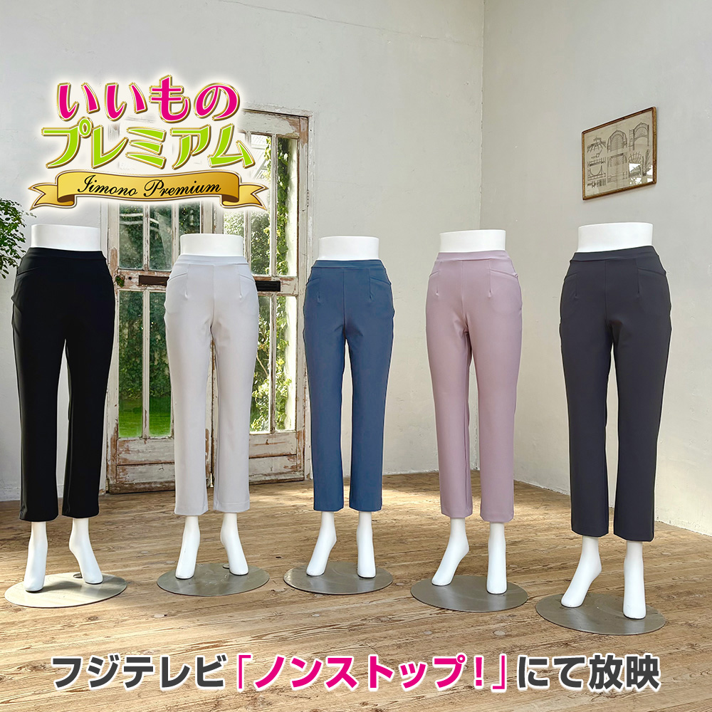 人気の「ARIKI美脚パンツ」シリーズ。はっ水加工とUVカット機能で、春から秋まで長く活躍。 (左から)(ア)ブラック(イ)ライトグレー(ウ)ブルーグレー(エ)ラベンダーピンク(オ)モードグレー