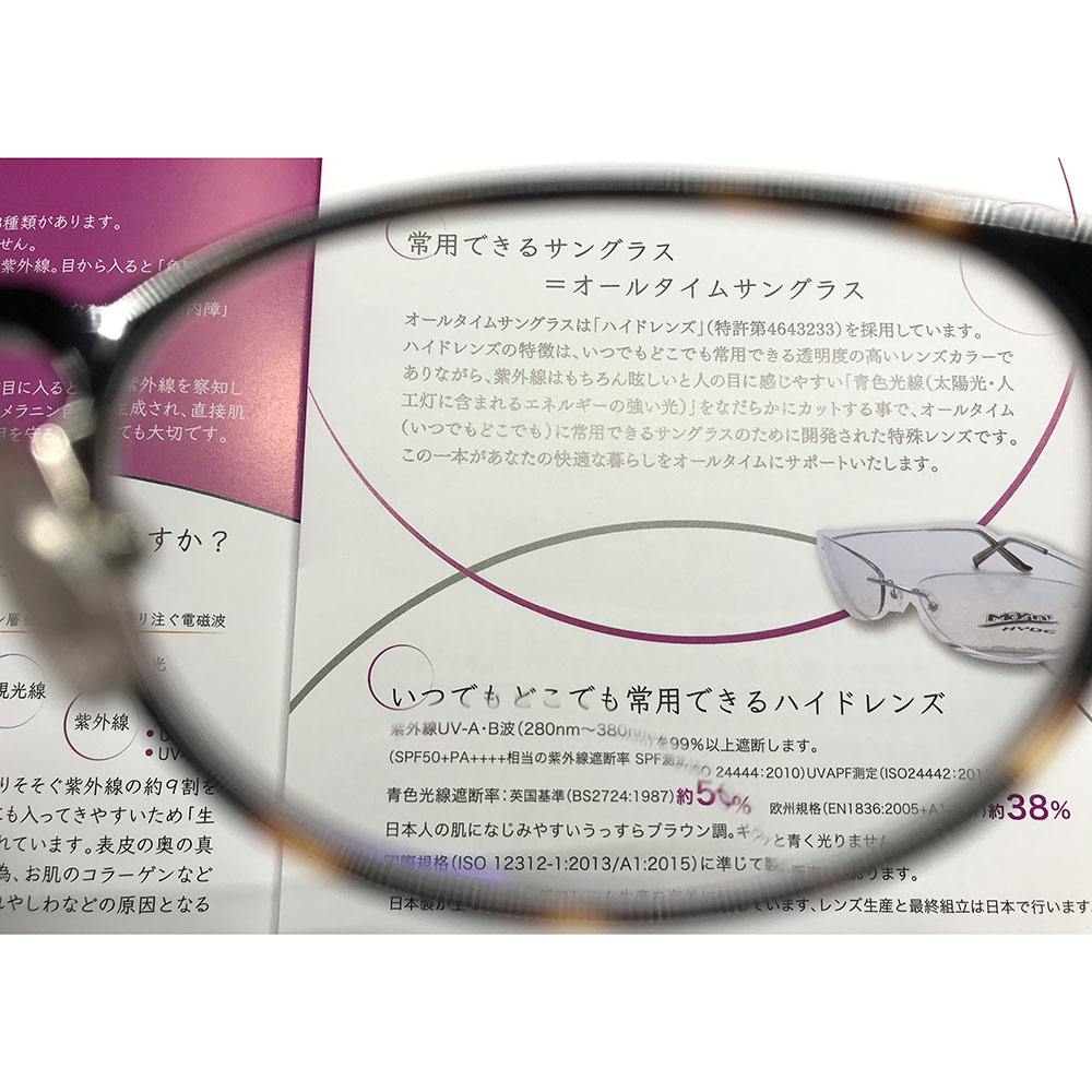 季節や場所を問わないクリアタイプのサングラス老眼付でさらに便利に。オールタイムサングラスは、特許レンズの「ハイドレンズ」を使用したクリアタイプのサングラスです。色付きサングラスは夏感が強く、室内での利用がしにくい場面もあります。しかし透明度の高いオールタイムサングラスなら、季節を問わず、室内での着用も自然で、いつでもどこでも、紫外線対策ができます。さまざまな生活シーンに溶け込みやすいシンプルなデザインと軽さで、日常的に使用いただけます。【ハイドレンズとは】紫外線はもちろん眩しいと人の目に感じやすい「青色光線(太陽光・人口灯に含まれるエネルギーの強い光)」をなだらかにカットする事で、オールタイム(いつでもどこでも)常用できるサングラスのために開発された特殊レンズです。【老眼鏡付で便利】レンズの下部に、一部”老眼レンズ”が入っています。買い物途中に値札や表示が見にくいとき、カフェでメニューが見にくいときも、わざわざ老眼鏡にかけかえることなく、視線を下側に落とすだけで、手元が見やすくなります。これなら、お出かけの際の老眼鏡持参も不要で便利です。度数は+1.00〜+2.00の3段階で選択可能です。※取扱の注意点レンズが汚れたら、手を洗うように中性洗剤で洗ってください。レンズは指の腹で優しく洗浄し、水分を優しくふき取ってください。眼鏡拭きで乾拭きすると、特許コートが剥離してしまいますので、おやめください。