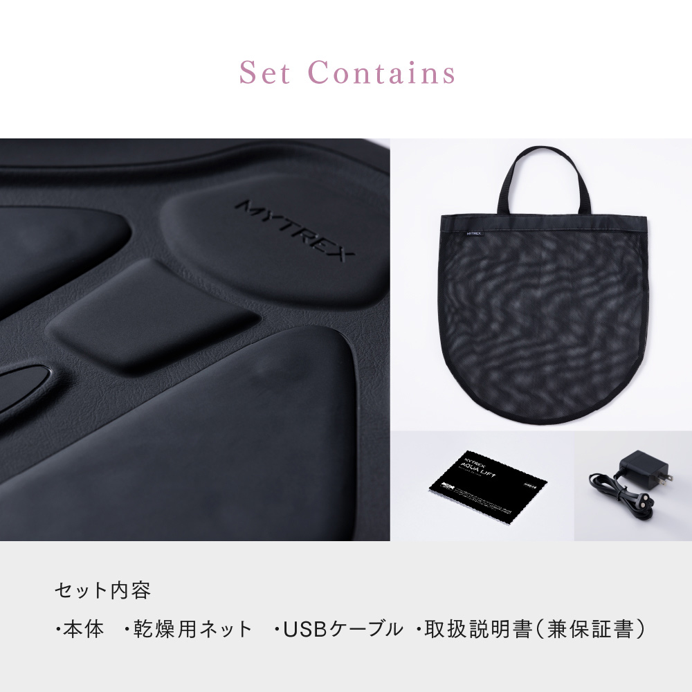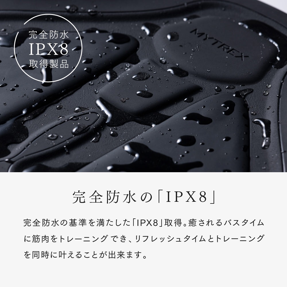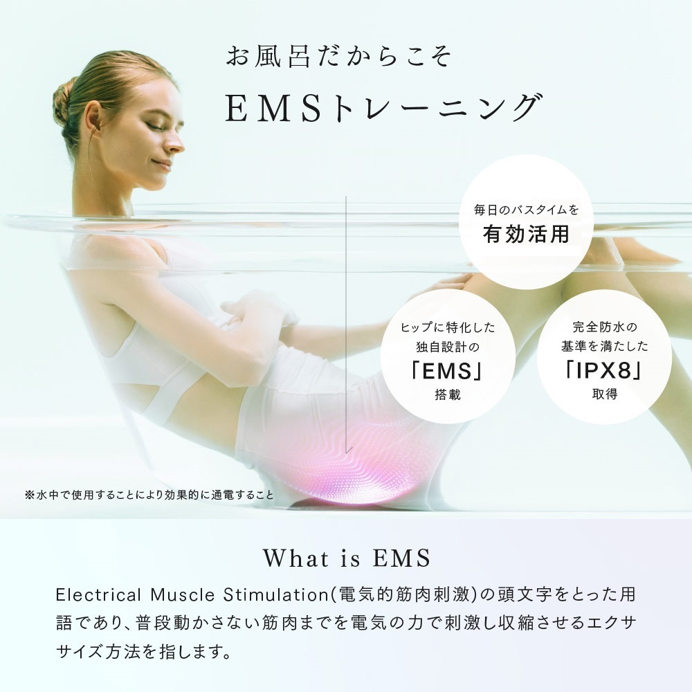 浴槽に沈めて座るだけ!お尻に簡単アプローチ。年齢はお尻に現れる?平たくなったり四角くなったり下がってきたり、いつの間にか年齢が現われやすいお尻。そんなお尻の筋肉は、毎日入るお風呂でトレーニングしちゃいましょう。やるべきことはお湯につかってお尻を乗せてリラックスするだけ。後ろ姿やパンツ姿に自信を持てる日も近い!美尻に必要な3つの筋肉へ独自EMSでアプローチヒップの高さをだす中臀筋(ちゅうでんきん)、ヒップの丸みをつくる大臀筋(だいでんきん)、ヒップへつながる太ももの筋肉ハムストリング。美しいお尻に重要な3つの筋肉を、独自のEMSプログラムで刺激。5種類の波形を組み合わせた1回15分のプログラムがでお尻の幅広い筋肉へアプローチします。使い方は簡単!浴槽に沈めて座るだけ 長時間水中で使用しても浸水しない完全防水設計(IPX8)。湯船につかりながら効率よくお尻のトレーニングできます。毎日入るお風呂なら、わざわざ服を脱いだり着たりする面倒もなく、気軽に続けやすい!―使い方―(1)充電口カバーが閉まっていることを確認し、本体を浴槽に沈めます。(2)本体の通電部にお尻や足を置きます。※左右の通電部に均等に肌が触れるようにしてください。(3)電源ボタンを長押しし、トレーニング開始★お手入れも簡単!サッと水洗いした後、付属の乾燥用ネットに入れて、風通しの良い日陰でネットをかけて乾燥させるだけ。お尻だけでなく太ももや足裏にも 座る位置や載せる部位を変えれば、お尻だけでなく気になる部分にもアプローチできます。※本製品は浴槽でお使いください。※画像は撮影用に衣服を着用しています。実際は浴槽内にて素肌でご使用ください。