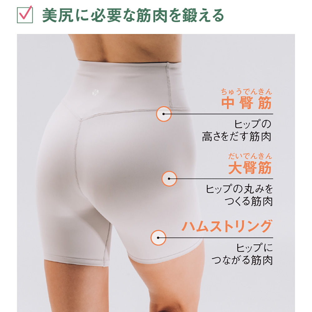 ヒップの高さを出す中臀筋、丸みをつくる大臀筋、ヒップへつながる太ももの筋肉ハムストリングをダイレクトに刺激。