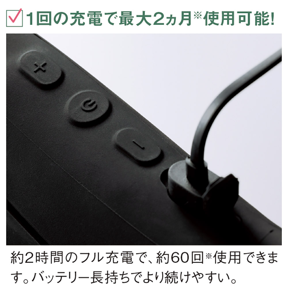 1回の充電で最大2カ月使用可能! ※レベル1で1日15分のご使用。1カ月を30日間とした場合。