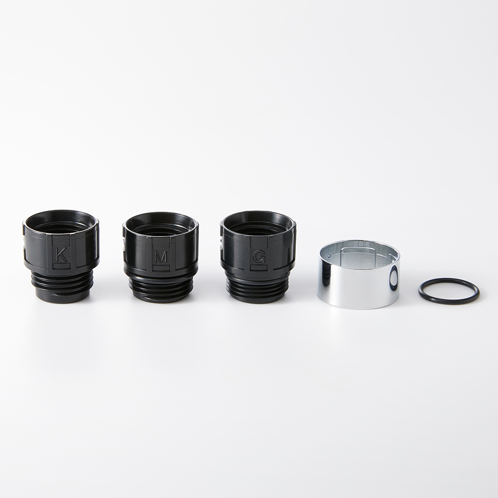 アダプター3種類(KVK・MYM・ガスター)・外装リング・ゴムパッキン(細)が付属