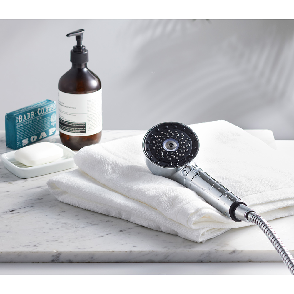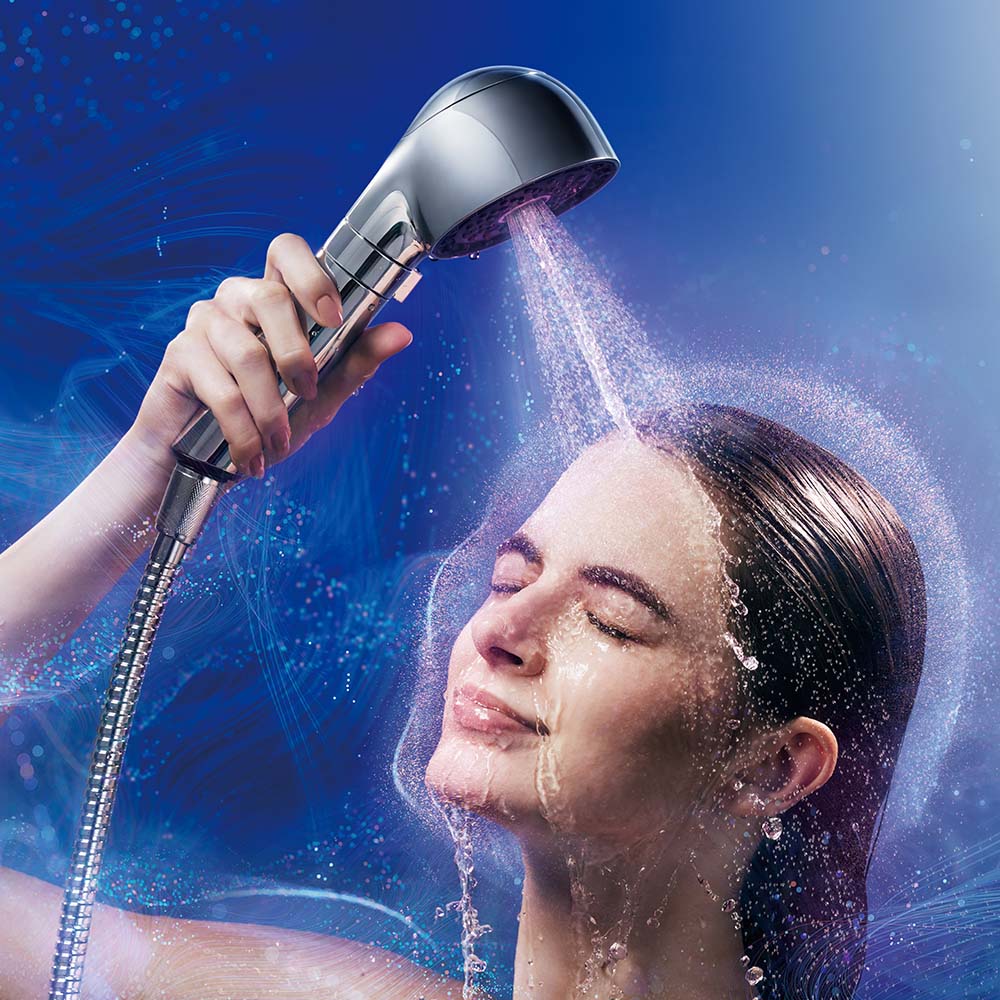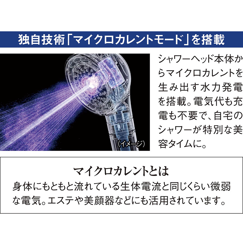 いわば“肌育”シャワー。微小なバブルを含むシャワーで美しく(※1)落としきれていない毛穴汚れや皮脂汚れは、肌の黒ずみ・ニオイなどの原因となることも。「MYTREX マイクロカレント シャワーヘッド」は、水流に直径0.001mm未満の毛穴よりも小さな泡「ナノバブル」を含み、毛穴の汚れなど細かい部分まで汚れ落ちをサポート。しっかり汚れを落とし、肌を美しく整えます。※1 汚れを洗い流すことによるマイクロカレントを生み出す機能を搭載数年かけて開発した独自技術で、シャワーヘッド本体からマイクロカレントを生み出す『マイクロ水力発電』を搭載(※2)。※2 マイクロカレントモード使用時。シャワーヘッドを手に持って使用した場合にのみマイクロカレントを発生させます。 ・・マイクロカレントとは?・・身体にもともと流れている生体電流と似た「体感的な刺激を感じさせない電流」。エステや美顔器などに活用されています。 好みに合わせて切り替えできる3モード!【マイクロカレントモード】マイクロカレントを発生する独自のモード※シャワーヘッドを手に持って使用した場合にのみマイクロカレントを発生させます。【ミストモード】霧状のミストを発生。肌あたりが良く、ふんわりと包み込むようなやさしい水流。シャワーの最後に仕上げとして使用すると◎。温かく全身を包みこむ「温ミスト」仕様にもこだわりました。【ストレートモード】水圧と水量が強くしっかりした浴び心地。一気に洗い流したい時や時短ケアに。カートリッジで水道水の塩素を低減浄水カートリッジ1本が付属。気になる残留塩素を低減します。※交換目安=約3か月(4人家族で1人あたり使用時間7〜8分、シャワー水量6L/分の場合)※使用時間や使用方法によってカートリッジの寿命は異なるため、目安としてお考えください。〜俳優 MEGUMIさん〜HIHO FINE BUBBLE シリーズ ブランドアンバサダー続けていくことが美しさに繋がっていく一番の近道。シャワーって1日の疲れや汚れなどを洗い落とす時間だと思っていましたが、それが美容の時間になるっていうのは素晴らしいし、驚きました。シャワーで自分をケアする時間になるっていうのはすごいことだと思いますし、皆さんも継続できるのではと思っています。※個人の感想です