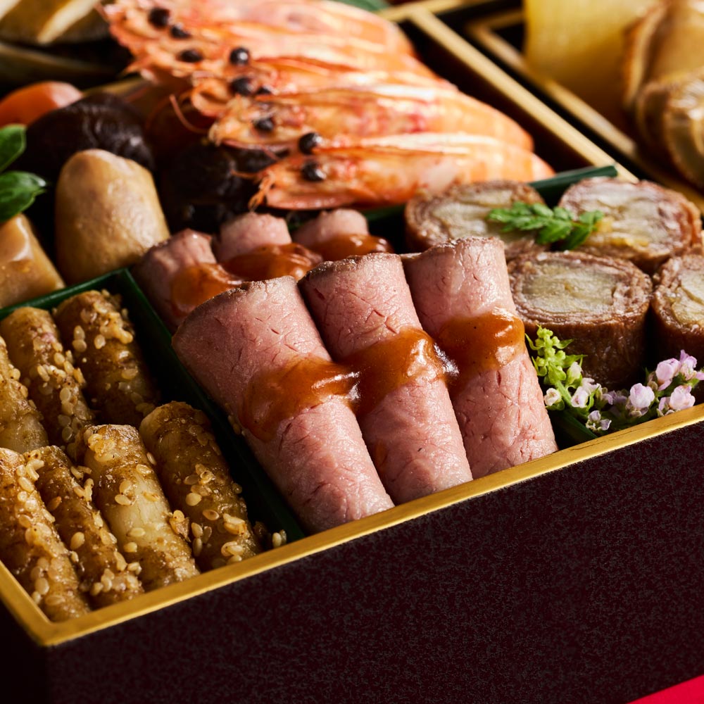 上段左から:たたきごぼう、丹波篠山産黒豆煮、国産野菜のお煮しめ、中段左から:天然ぶりの焼き漬け、栗きんとん、萩伝統焼抜き蒲鉾 村四郎、下段左から:特上 伊達巻、田作、黒毛和牛の八幡巻