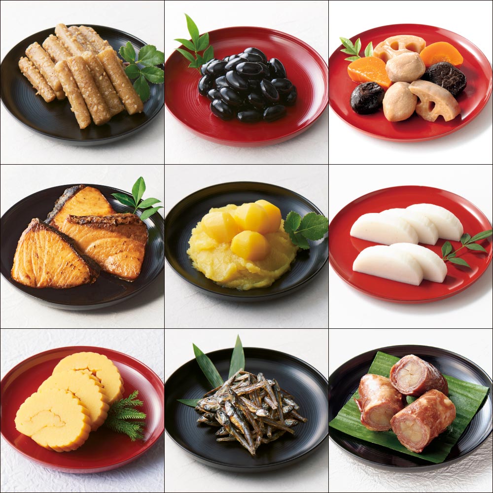 上段左から:たたきごぼう、丹波篠山産黒豆煮、国産野菜のお煮しめ、中段左から:天然ぶりの焼き漬け、栗きんとん、萩伝統焼抜き蒲鉾 村四郎、下段左から:特上 伊達巻、田作、黒毛和牛の八幡巻