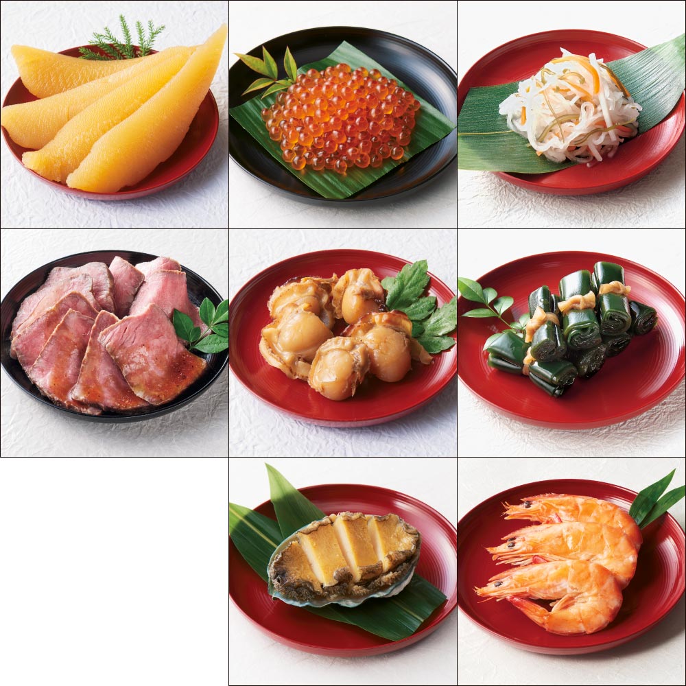 上段左から:国産味付数の子、いくらの醤油漬、紅白なます、中段左から:白老牛ローストビーフ、青森県産 焼き帆立、宝巻、下段左から:国産あわび煮貝、白姫海老の旨煮