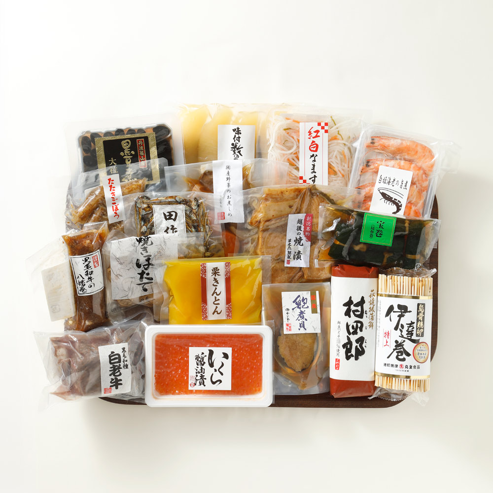 お届けは12月29日もしくは12月30日になります。日付指定は承れません。商品ページに記載の内容にかかわらずANAmall店では日時指定を承ることができません。誠に恐れ入りますが何卒ご了承ください。クレジットカードでのお支払いの場合は、商品のお届け時期まで有効期限・ご利用限度額が有効であるクレジットカードをご利用ください。出荷時にカードの有効性が確認できない場合はご注文がキャンセルとなる可能性、もしくはANAモール上での決済が完了せずマイルが貯まらない可能性がございます。あらかじめご了承ください。日本各地から選んだ自信の味縁起のよい品々、山海の幸。国産主原料にこだわり、日本各地の素材を味わい豊かに仕上げた17品目をご用意。※無くなり次第終了となりますのでお早めにご注文ください。※お届け日:12月29日、30日の日時指定を承ります。国産主原料にこだわり厳選。冷蔵で届くから美味しさが違います。もしお重がなくても、大丈夫。大きなお皿におせちを彩りよく並べるだけで、お祝いの華やかさを演出できます。個包装なので、1日目と2日目の料理を盛り分けたり、人数分を取り分けたりと、自由なスタイルで楽しめます。■17品目 4〜5人前※お重は付きませんのでご注意ください。1.国産野菜のお煮しめ:すべて国産の野菜を使用し、創業112年の老舗佃煮屋のこだわり。2.荻伝統 焼抜き蒲鉾:国産のエソを使用。きめ細かな白い肌、ソフトな弾力が自慢です。農林水産大臣賞(平成24年)受賞3.黒毛和牛の八幡巻:旨み豊かな九州産黒毛和牛でごぼうを手巻きして煮込みました。4.丹波篠山産黒豆煮:2Lサイズの大きな丹波篠山産の黒豆を上品な甘さに仕上げました。5.栗きんとん(いもあん):さつまいもあんに、ほっくりとした丸ごとの栗の甘露煮をのせて。6.田作:国産カタクチイワシを香ばしく焙煎し、醤油と砂糖で風味豊かに。7.たたきごぼう:香り良い秋ごぼうの風味と食感を生かし、胡麻で和えました。8.天然ぶりの焼き漬け:北海道産のぶりを素焼きし、醤油ベースのたれに漬け込みました。9.伊達巻(烏骨鶏卵使用):使用している卵の約50%は烏骨鶏卵。コクのあるフワフワの食感。10.紅白なます(昆布入り):柚子風味であっさり味に仕上げた、昆布がアクセントの甘酢漬け。11.宝巻(昆布巻):北海道産の昆布を無漂白の干瓢で巻いて炊き上げ、やわらかく。12.白姫海老の旨煮:鮮度の良い九州産白姫海老を薄味に仕上げた旨煮です。13.いくらの醤油漬:北海道産秋鮭のいくらの醤油漬は粒がやわらかく濃厚な旨み。14.青森県産焼き帆立:陸奥湾で旬の時期に獲れた帆立のみを使用し、濃厚な味わいに。15.国産あわび煮貝:シコシコの食感と醤油の芳醇な香り、やわらかな炊き上がり。16.国産味付数の子:北海道産の数の子を、だしをきかせた醤油だれで調味しました。17.白老牛ローストビーフ:良質な赤身と霜降りが特徴の北海道の黒毛和種「白老牛」のもも肉を、塩と胡椒のみで味付け。とろけるような食感を楽しめます。