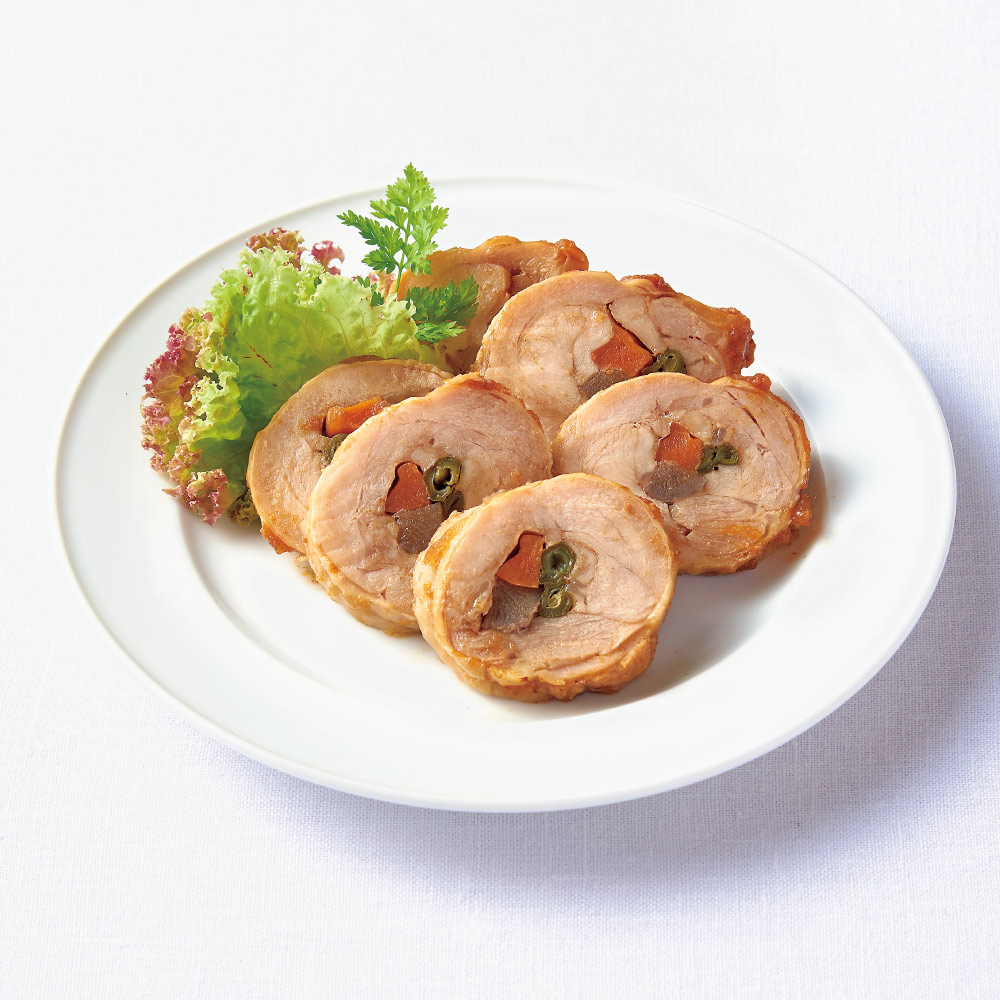 洋風チキンロール 国産鶏もも肉で野菜を巻いたチキンロール。デミグラスソースを絡め、やわらかく仕上げました。