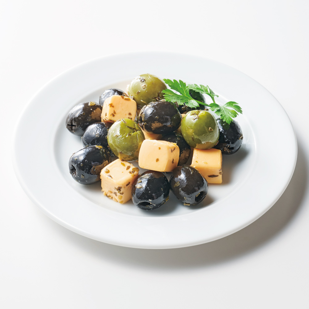 オリーブ&チーズ マリネした種抜きオリーブ&コクのあるチェダー系チーズ。一度食べたらとまらない旨さです。