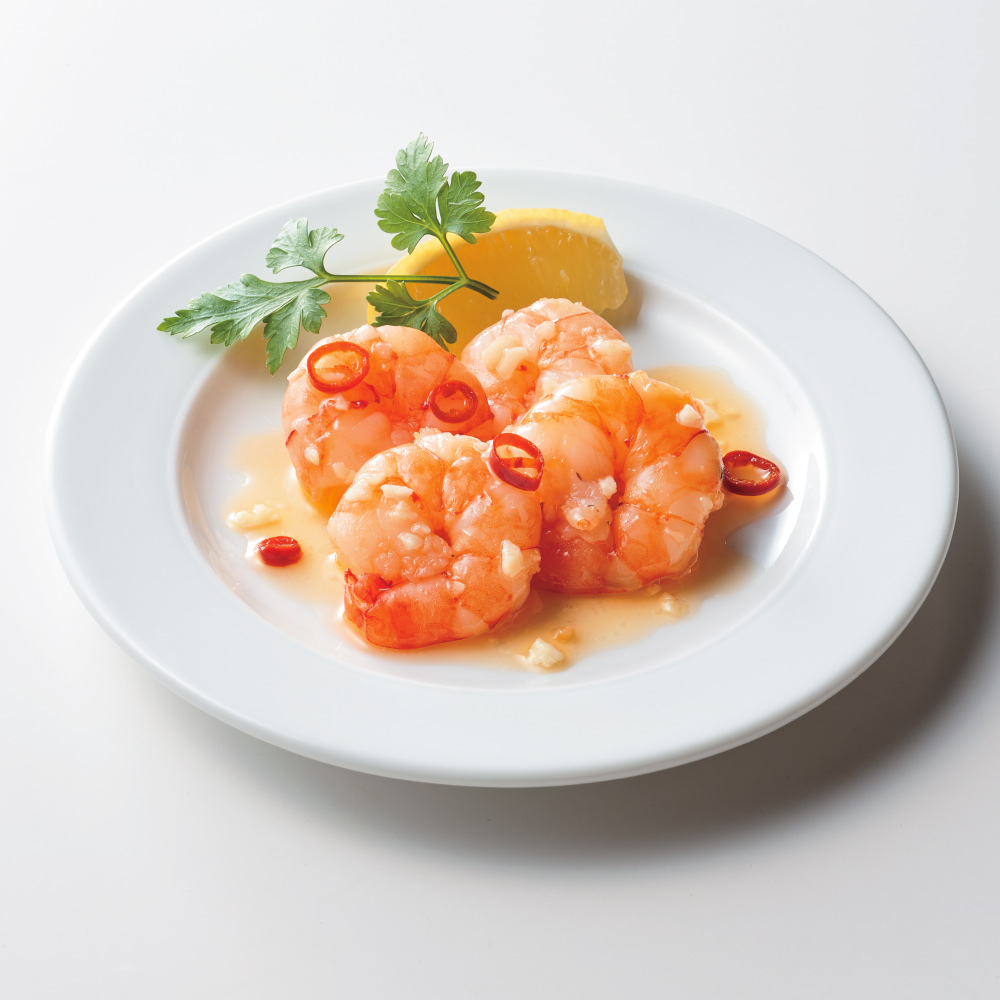 海老の冷製アヒージョ スペインバルのアヒージョを冷静にアレンジ。ブラックタイガーにニンニクの香りが鮮烈です。