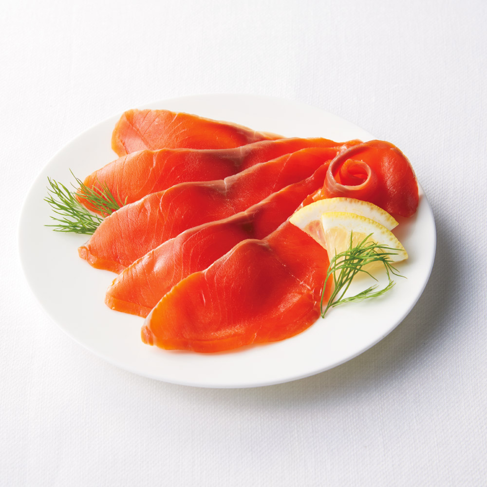 紅鮭スモークサーモン とろける舌ざわりのロシア産。紅鮭の旨みを生かし、桜のチップで燻製しました。