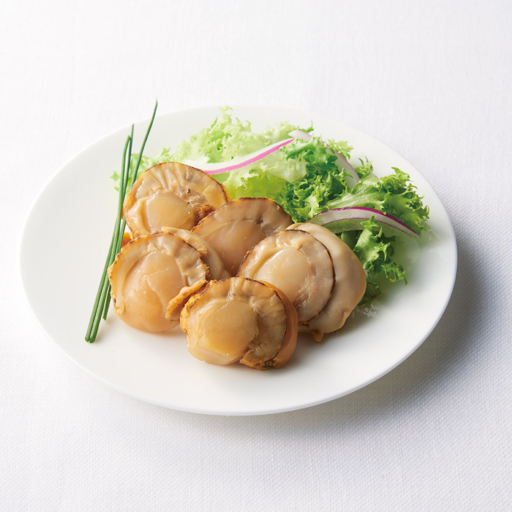ほたてのスモーク 噴火湾産のほたてを使い、やわらかな食感と歯ごたえを残しつつスモークしました。