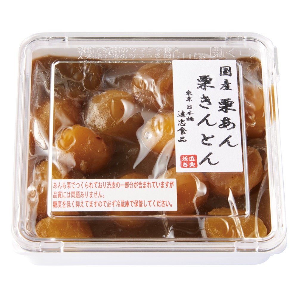国産栗の餡もたっぷり。渋皮入りの栗きんとん。※お申込締切日は12月17日となります。国産栗を使い、栗餡には渋皮も入れて直火釜で炊き上げた贅沢なきんとん。甘さ控えめで、栗そのものの味を楽しめます。