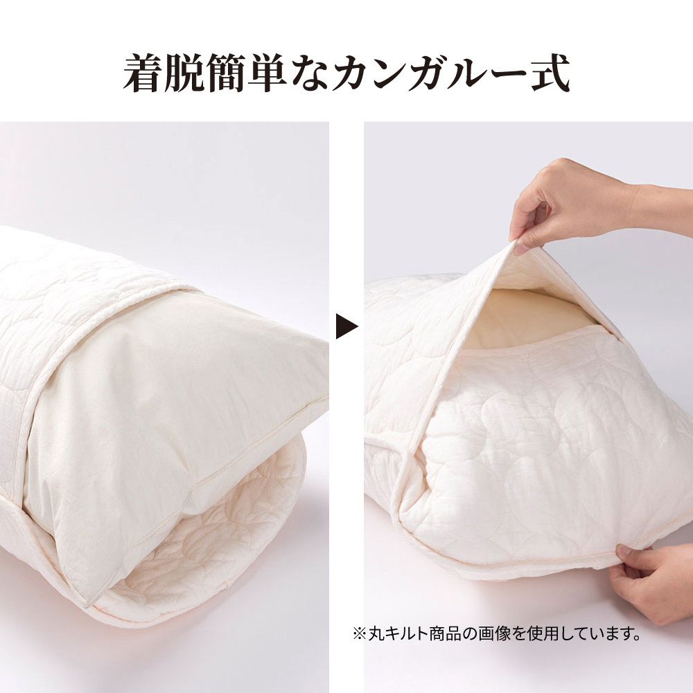 ピローケースはファスナーやボタンを使わないカンガルー式。かぶせがあるため枕が飛び出すことなく美しく着けられます。