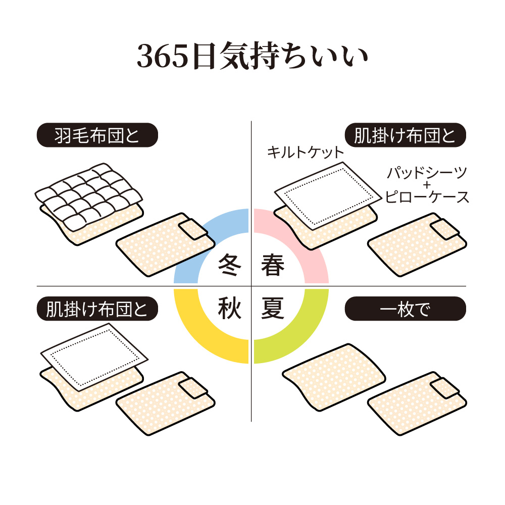 夏は一枚で、それ以外の季節は掛け布団の下に入れて。ちょうどいい暖かさでムレを防ぎ、気軽に洗えて睡眠環境を清潔に保てます。