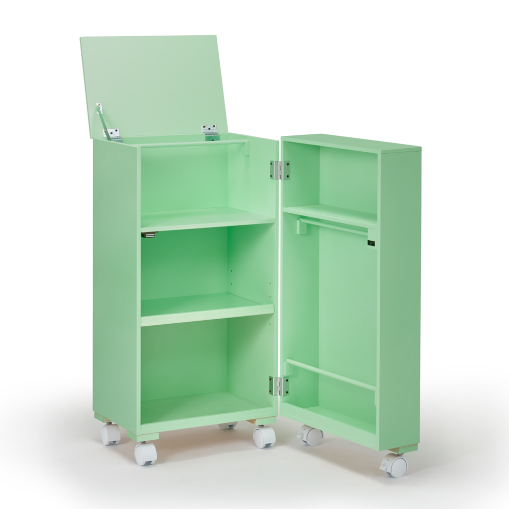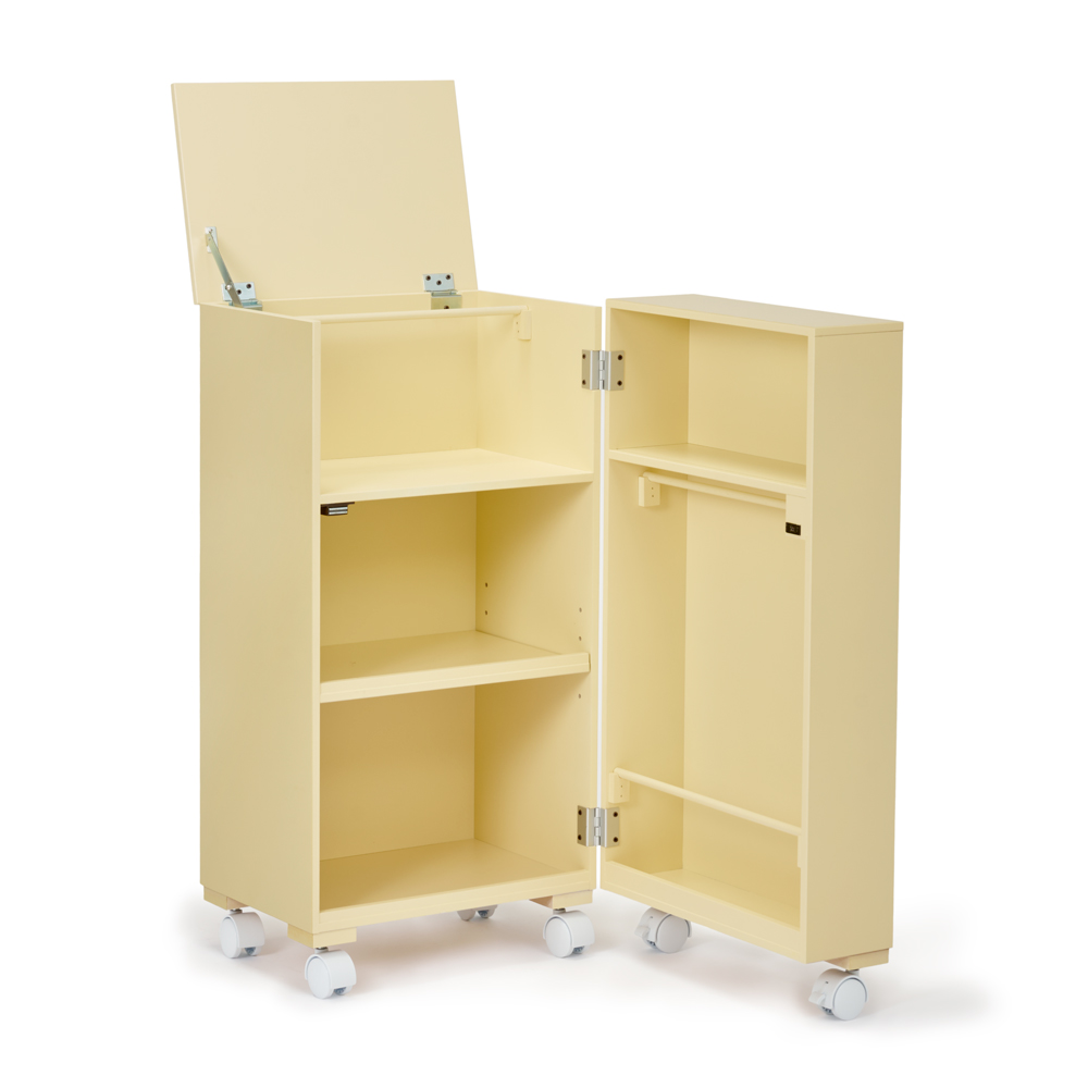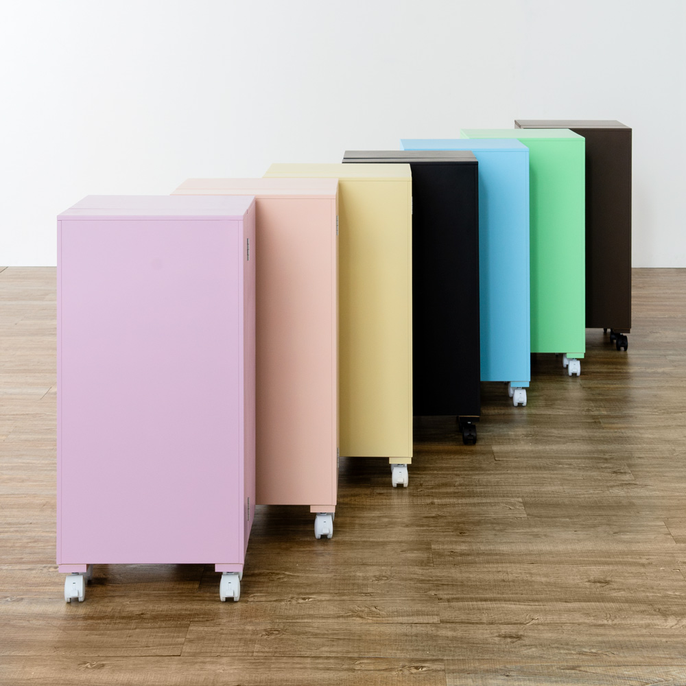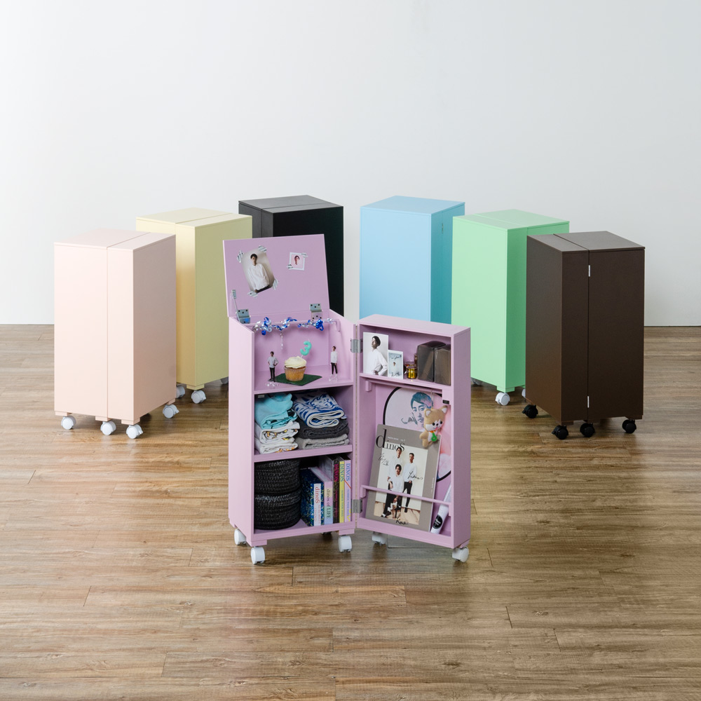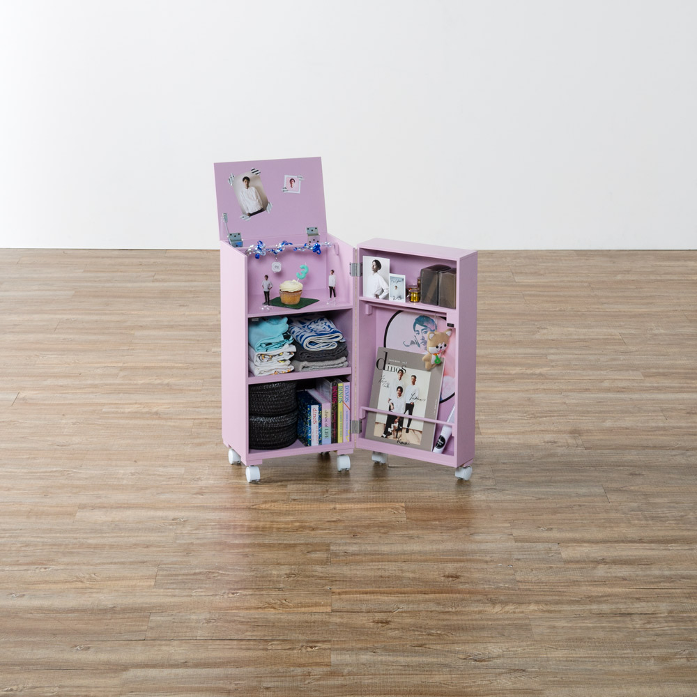 あなたの推しをいつも身近に感じられる推し活ワゴンに、!もっともっと推しを身近に感じられる「推しカラー」が新登場!※受注生産の為、ご注文後1ヶ月程度でのお届け予定となります。扉を閉じれば場所を取らないキャスター付きワゴン。でも扉を開ければ、そこは収納たっぷりの推し祭壇!すっきりコンパクトに収まるスリムサイズ。大事な推しグッズを安全にお守りできるよう、日本国内で職人達が1点1点心をこめて手作りしています。熱い声にお応えし、「推し色総選挙」で人気の7色を商品化!推しをもっと身近に感じられる「推しカラー」ver.が新登場!!?※現在ダークブラウン色は「おすすめ関連商品」にある通常色ページにて販売しております。あなたの推しの祭壇を推しカラーでまとめてあなたの「推し愛」を表現してみませんか?いつでも“推し”を感じていたいけど、人の目が気になる…アイドル、俳優、声優、アニメキャラ、Kpopアーティストなど愛してやまない“推し”の存在。CDやDVD、写真集などのグッズを眺めては毎日ニヤニヤ、推しがいるから頑張れる!という方も少なくありません。ただ問題なのが、日々増えていく推しグッズをどう収納するか…。そこでご紹介したいのが、その名も『推し活ワゴン』。見た目はキャスター付きのシンプルなワゴンですが、扉を開けると…そこは思い出や宝物が詰まった推しの祭壇!推しを常に身近に感じていたけど、グッズは隠しておきたい…という方にもおすすめです。【ポイント1】場所を取らないキャスター付き●キャスター付きで、ソファやデスク、ベッドサイドなど好きな場所にコロコロ移動でき、しかもとっても省スペース!●何よりいつもそばに推しがいてくれるのは至福の喜びです。【ポイント2】見た目は普通のワゴン、開ければ推し祭壇●シンプルで美しいサイドテーブルのように見えますが、扉を開けて、フタを上げると、愛してやまない推しの宝庫。●CDやDVD、書籍類はもちろん、うちわやキーホルダー、Tシャツもしまえて、お気に入りの写真やアクリルスタンドを飾ることも可能。●グッズの入れ替えや整理整頓しやすいのもワゴンのよさです。〈内部仕様〉●扉をあけると、向かって右側には棚が3段。向かって左側にも収納スペースがあり、雑誌や大判うちわも大切に保管できます。●フタを開けた上部は、推しのためのアクリルスタンドステージ。誕生祭などの記念日には画像をSNSにアップしてみては。●ラバーバンドやリストバンド、キーホルダーを吊せる棒付き。雰囲気のある背景を作ったり、作中のシーンを再現したりと妄想が広がりそう。●フタの裏側にはお気に入りの推し写真をマスキングテープで貼ってデコレーションするのも楽しい。●棚は3cmピッチで可動でき、大きな特典付きCDやDVDもきれいに収まります。●ライブTシャツやタオルなど布ものの収納も可能。●トレーディングカードが挿せる溝付きなのも便利です。【ポイント3】動画視聴ができるこだわりの高さ●天板の高さは、動画視聴がしやすい約69cm。飲み物などを置くのにもちょうどいい高さ。●推しのインスタライブ鑑賞やWEB配信もワゴンの上で楽しめます。