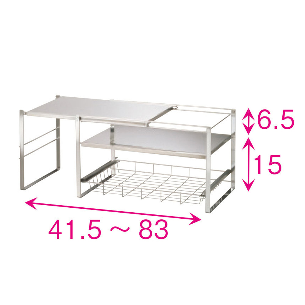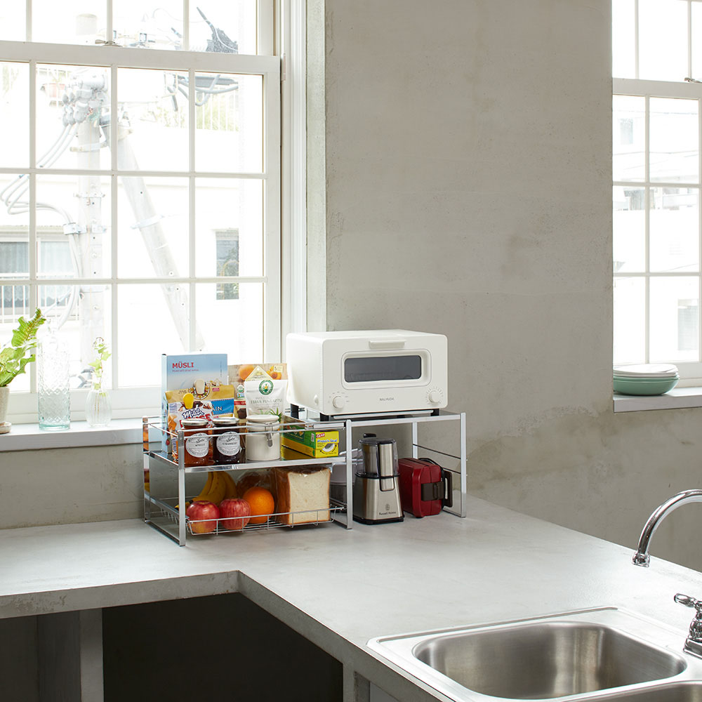 一緒に使うものはまとめて、トースター周りに効率収納できるラック。パンやジャム、コーヒーなど、トースター近くにあると便利なものはスライドバスケットに収納。これなら朝食の準備も時短できるようになります。お手入れしやすいステンレス製で、置き場所に合わせて幅ぴったりに置ける伸縮式です。台所のトースター周りにものが散らかっていて片付かないという方にもおすすめ。トースター周りをすっきり、使いやすくするラック●キッチンカウンターやシンク上のトースター周りを、すっきり便利なコーナーにできます。●トースターと一緒に使うものをまとめて収納でき、スペースを有効活用できます。●幅は47〜88.5cmの間で無段階に伸縮でき、置き場所にぴったり設置できます。●トースターの下のスペースにはブレンダーなど調理家電も収納できます。●スライドバスケットにはパンやフルーツなどが収納でき、奥のものもスムーズに取り出せます。●中棚にはシリアルの箱やキャニスター(保存容器)など、背の高いものも置けます。●スライドバスケットは左右どちらにも設置できます。●棚板はステンレス製で熱や水に強く、汚れもサッと拭き取れて清潔に保てます。置き場所、収納したいものに合わせて2タイプから選べます●シリーズ商品は、標準タイプ(高さは27.5cm)とハイタイプ(高さ41cm)の2タイプをご用意しています。●ハイタイプのスライドバスケットには山型食パンも立てて置けます。●国内工場で丁寧に作られた日本製です。●完成品でお届けします。