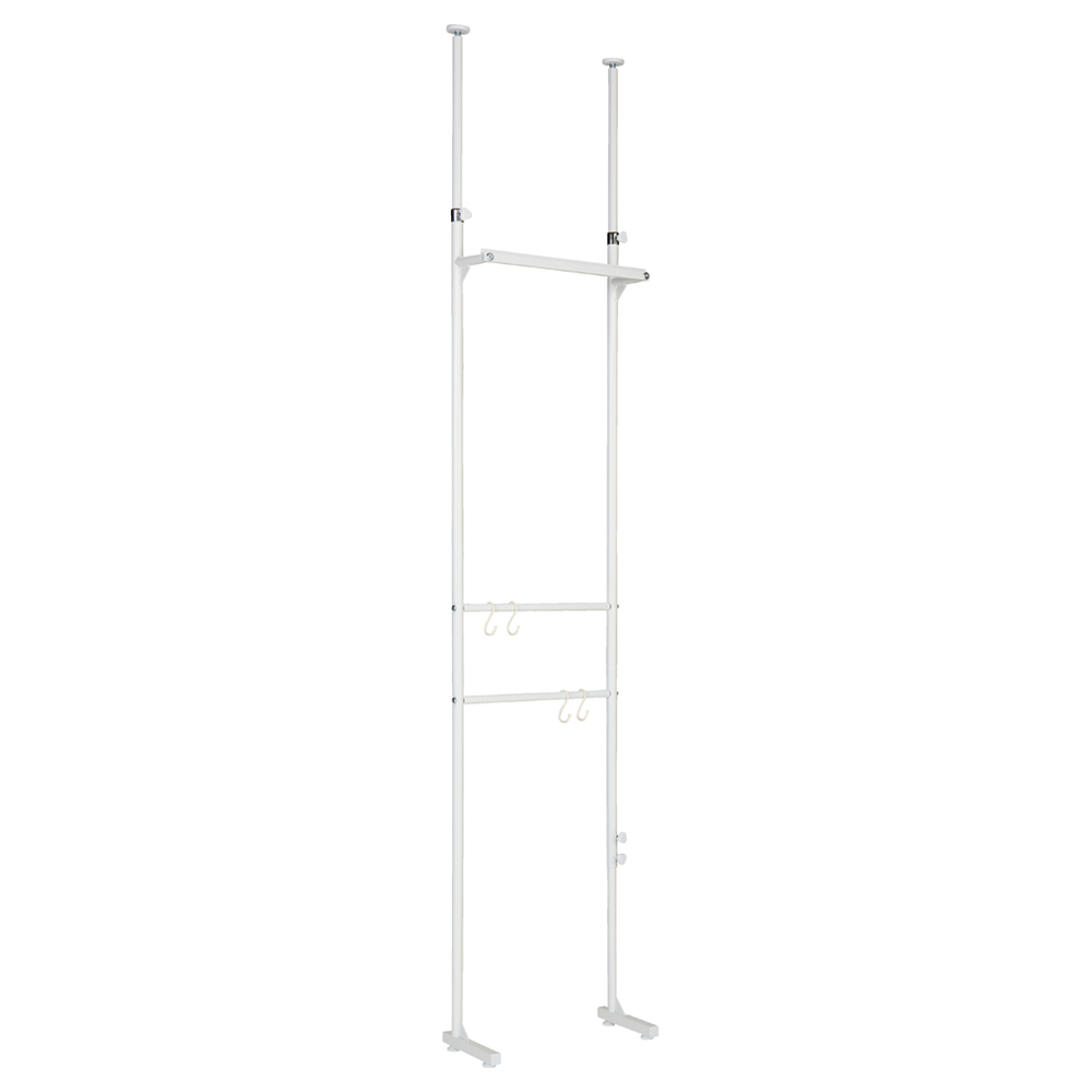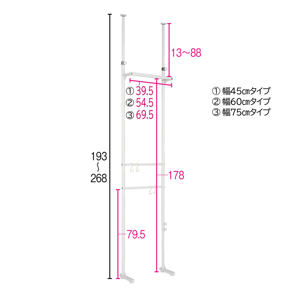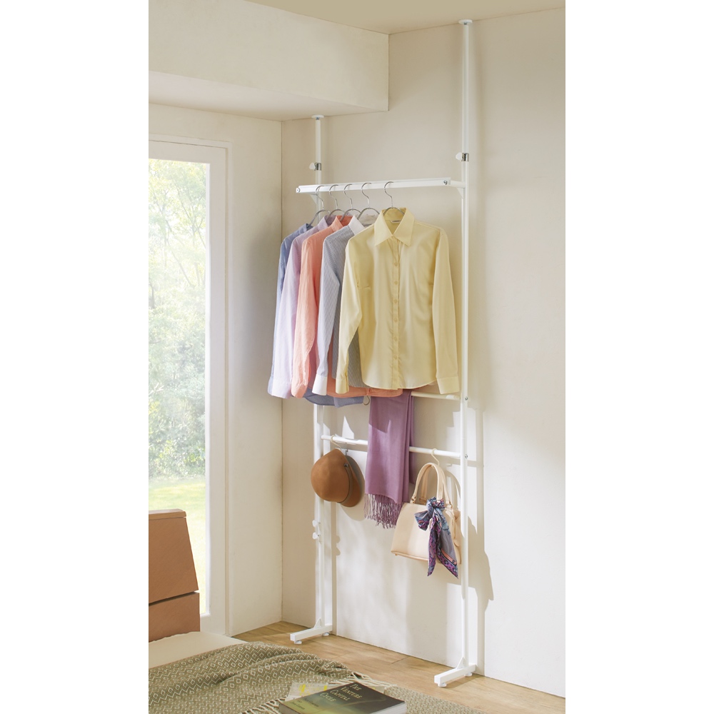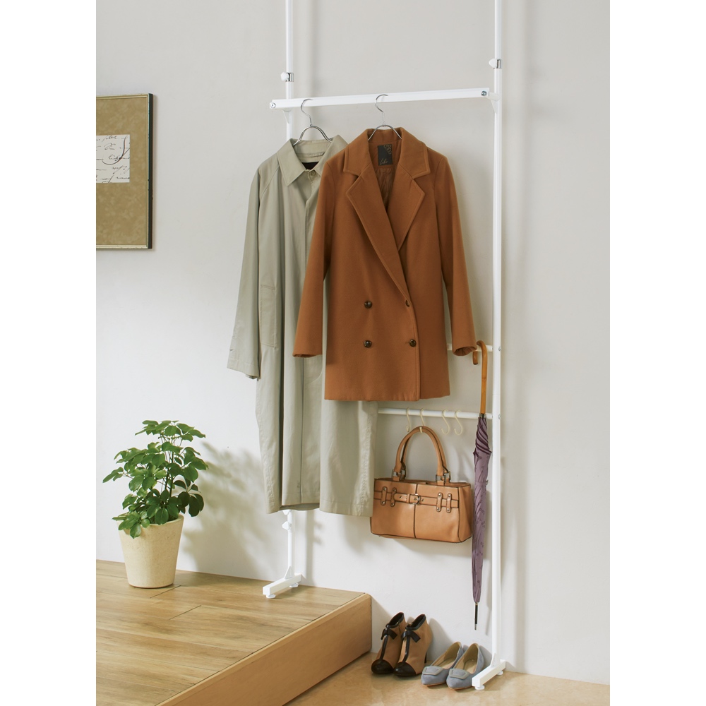 雨に濡れたレインコートや花粉を浴びた上着は、そのまま家に上げたくない。玄関のクロークで、頑張った上着をリフレッシュ。服も邪魔にならないように奥行きを節約した、玄関用薄型ハンガーラックです。玄関で邪魔にならない奥行本体の奥行きはわずか21.5cm。上段のバーは、ハンガーをひっかけるだけでナナメになる特殊構造。洋服が斜めに掛けられ、服を掛けても奥行わずか(約)22cm。奥行スペースが節約できます。安定感もあります薄型なので、華奢なのでは?天井突っ張り式なので、転倒しない丈夫な設計です。段差があっても大丈夫片方の脚部が高さ調節可能。組立時に左右を選んで、高さ38.5cmまでの框の段差をまたいで設置できます。フックも付属S字フックが4つ付属しています。エコバッグやスカーフ、ペットのリードなどをひっかけて収納できます。省スペースだから圧迫感が少ない薄型のハンガーラック。玄関だけでなく、お部屋のハンガーラックとしても。