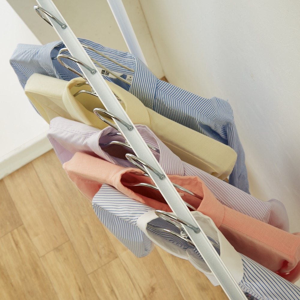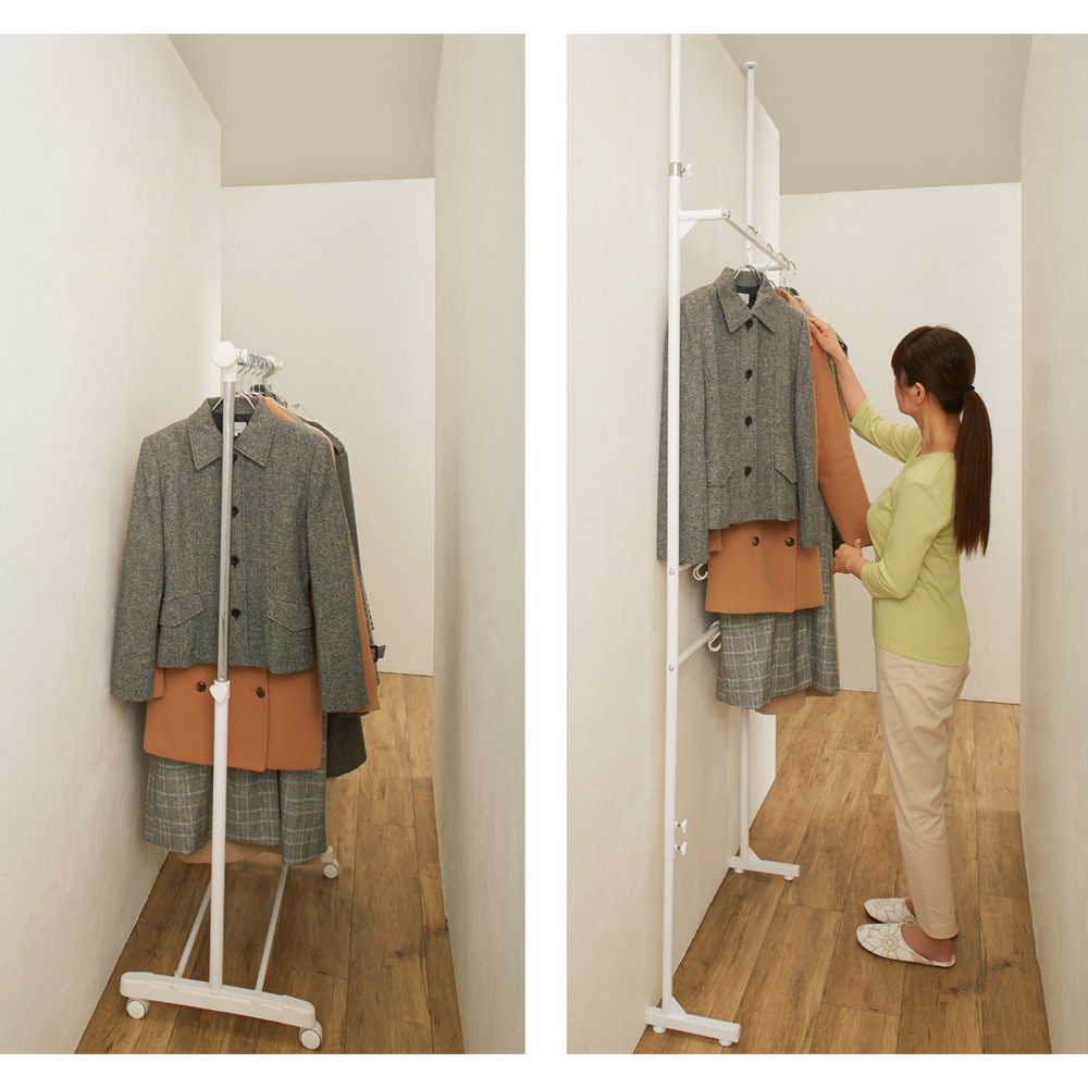【ナナメ掛けだとこんなに違う!】上段のバーは、ハンガーを引っ掛けるだけで斜めになる特殊構造。普通のハンガーラックでは奥行が深く通路が確保できません。