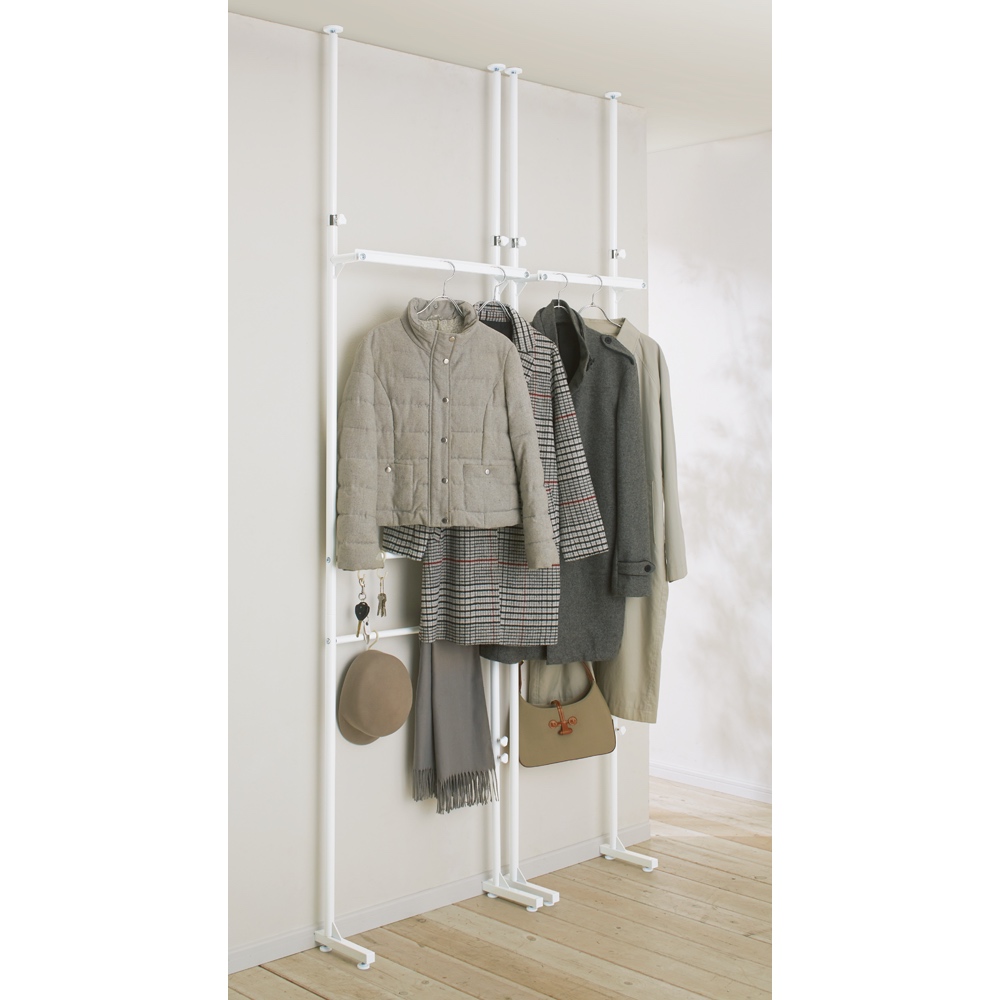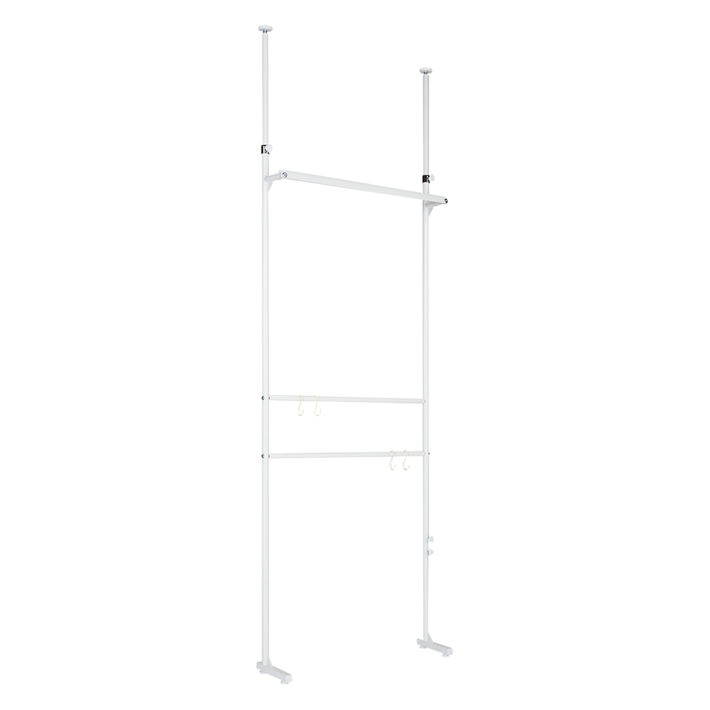 雨に濡れたレインコートや花粉を浴びた上着は、そのまま家に上げたくない。玄関のクロークで、頑張った上着をリフレッシュ。服も邪魔にならないように奥行きを節約した、玄関用薄型ハンガーラックです。玄関で邪魔にならない奥行本体の奥行きはわずか21.5cm。上段のバーは、ハンガーをひっかけるだけでナナメになる特殊構造。洋服が斜めに掛けられ、服を掛けても奥行わずか(約)22cm。奥行スペースが節約できます。安定感もあります薄型なので、華奢なのでは?天井突っ張り式なので、転倒しない丈夫な設計です。段差があっても大丈夫片方の脚部が高さ調節可能。組立時に左右を選んで、高さ38.5cmまでの框の段差をまたいで設置できます。フックも付属S字フックが4つ付属しています。エコバッグやスカーフ、ペットのリードなどをひっかけて収納できます。省スペースだから圧迫感が少ない薄型のハンガーラック。玄関だけでなく、お部屋のハンガーラックとしても。