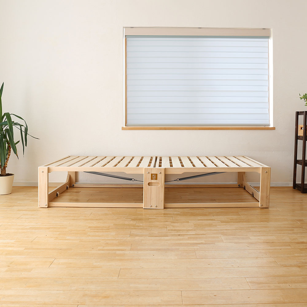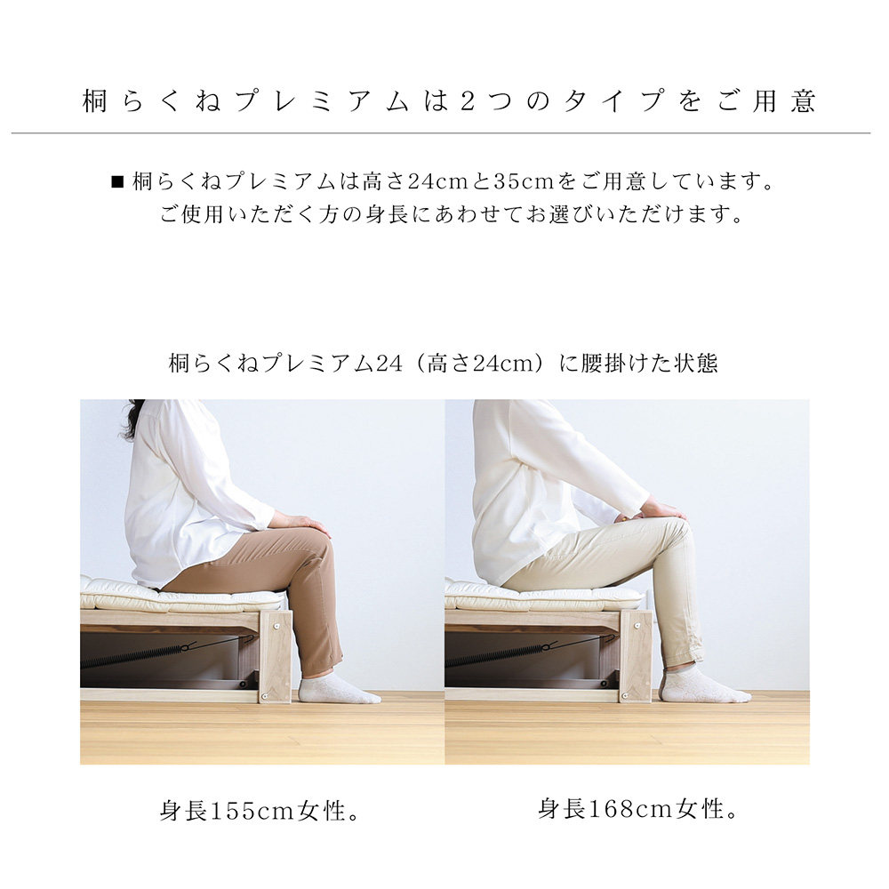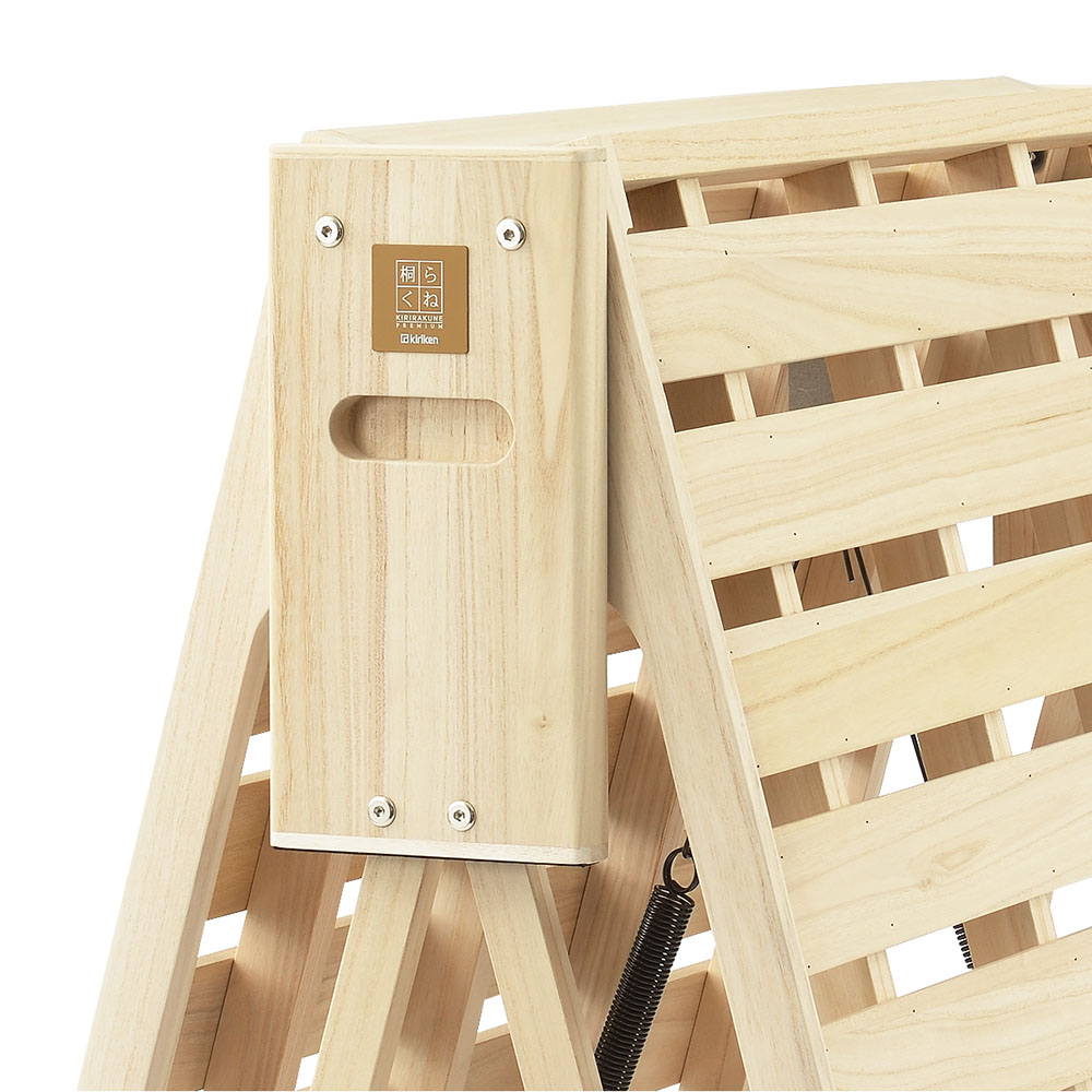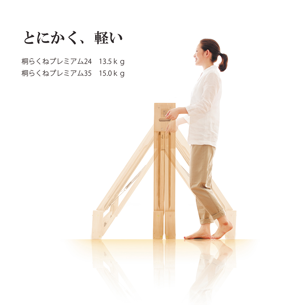 ふとんが干せる総桐ベッド。使いたいときにサッと出せるキャスター付き桐の折り畳みベッド。指の力でラクにたためて軽々とキャスター移動でき片付けも簡単!ベッドの側面中央部にある穴に手をかけて持ち上げるだけで簡単に二つ折りになります。収納時や急な来客時にも便利です。6個のキャスターがスムーズな折りたたみをサポート。畳や床を傷付けにくい独自設計のキャスターは、通常は滑らかに動き、荷重がかかると床面にしっかりと固定されます。有名旅館でも客室に「桐らくねシリーズ」が採用されています。【オススメするポイント】(1)『桐』でできているから 軽い!(2)畳や床が傷つきにくい(3)ちょうどいい高さで寝心地抜群(4)軽くコンパクトに収納(5)安心のステンレスストッパー(6)Rデザインとフェルトクッション(7)横揺れしない構造【ポイント1】『桐』でできているから 軽い!構造材の中でNo.1の『軽さ』を誇る「桐」を主用材とし、従来の折りたたみベッドの常識を超える軽さを実現!移動や折りたたみがとても簡単です。桐だからとても寝心地がやわらかく、やさしく体を支えてくれます。また、『桐らくね』は、わずか 3kg程度の力で持ち上がります。思わず笑ってしまうほどです。想像を超えたこの軽さをご体感ください。総重量は約13.5kg (24センチタイプ)軽量なので、どなたでも簡単に取り扱いできます。(35センチタイプは約15kg)【ポイント2】畳や床が傷つきにくい独自設計の「アップダウンキャスター」の構造により、荷重がかかった時にベッドの脚部が床面にしっかり固定されます。ベッド脚部の広い面で全体を支えるため、力が分散し、畳や床が傷つきにくいようになっています。「アップダウンキャスター」は、荷重がかかっていない時は、 浮き上がり、床面と5mmの隙間をつくります。お掃除も移動も簡単です。【ポイント3】ちょうどいい高さで寝心地抜群床面からの高さは24cmと35cmの2つのタイプがあります。少し厚めの布団で驚くほど快適な寝心地を体験できます。24cmのタイプは敷布団を載せると高さが概ね32cm~34cmほどになります。35cmのタイプは敷布団を載せると高さが概ね43cm~45cmほどになります。【ポイント4】軽くコンパクトに収納折りたたみ時の幅はわずか18cm (24cmタイプ・35cmタイプ)わずかな隙間にピッタリ収納。折りたたみベッドで、たたんだ時の邪魔な脚問題を解決しました。壁際でもクローゼットでも、スッキリ収納できます。コンパクトに収納できるので、お客様用のベッドとしてもご利用いただけます。【ポイント5】安心のステンレスストッパー安全にお使いいただけるステンレスストッパーを標準装備。布団干しや、お掃除の時など、小さいお子様がいても安心してお使いいただけます。【ポイント6】Rデザインとフェルトクッション桐らくねプレミアムは各部に丸みを持たせるデザインで手触りが格段に向上しています。中央のフレーム下部にフェルトクッションを張り、人にも床にもやさしいベッドになりました。 【ポイント7】横揺れしない構造桐らくねは、横揺れしない構造で作られています。長期間でも安心してお使いいただけます。