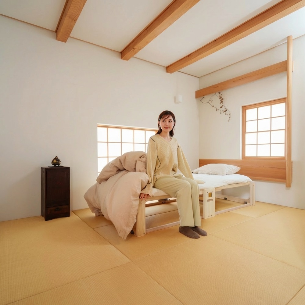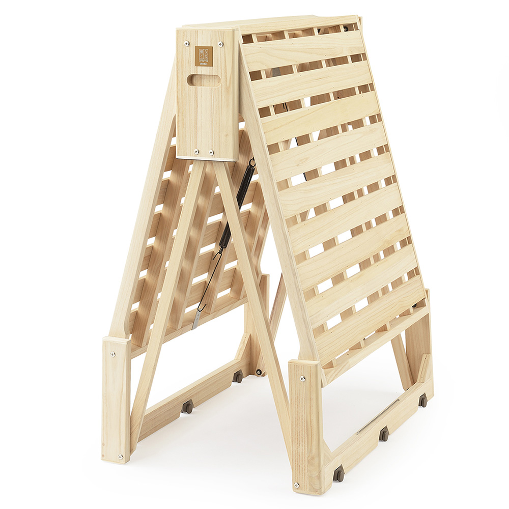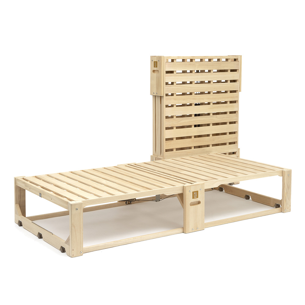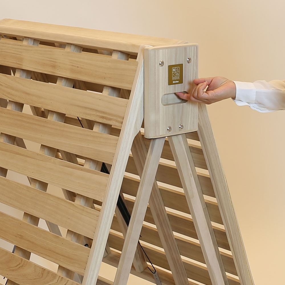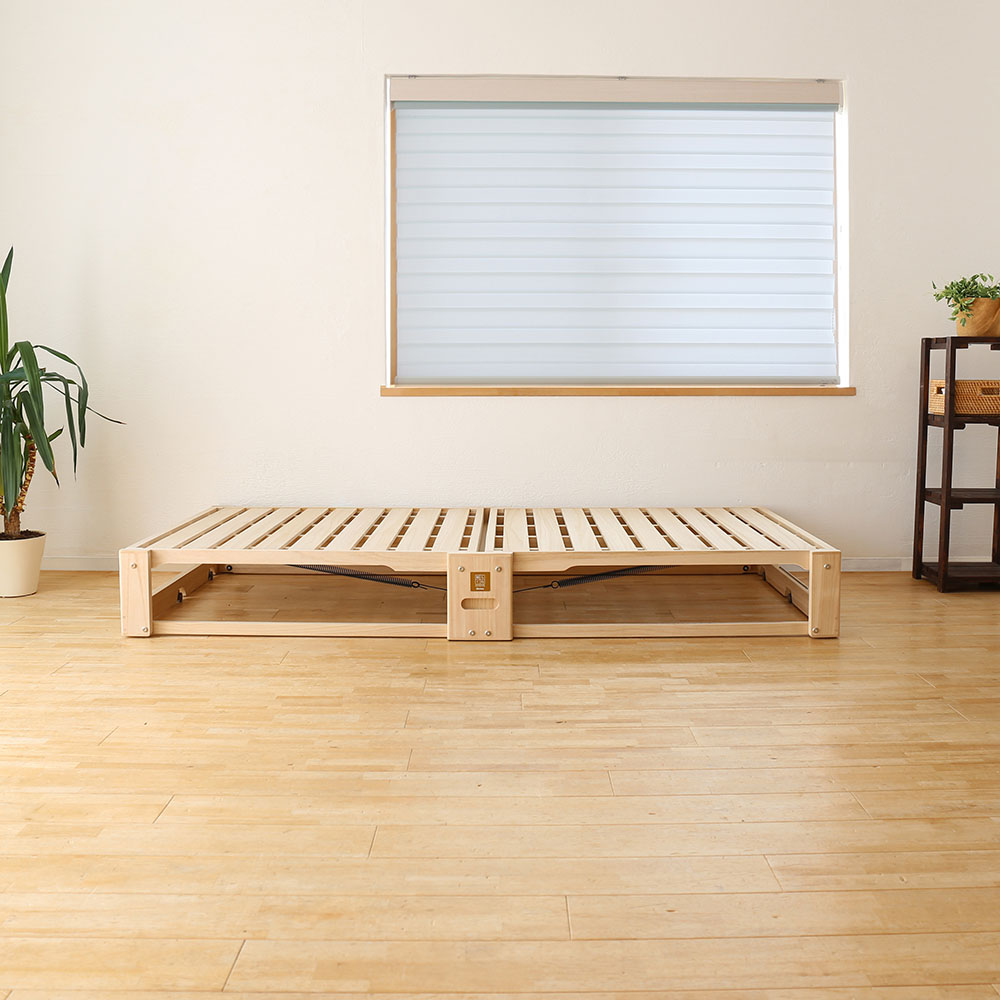 ふとんが干せる総桐ベッド。使いたいときにサッと出せるキャスター付き桐の折り畳みベッド。指の力でラクにたためて軽々とキャスター移動でき片付けも簡単!ベッドの側面中央部にある穴に手をかけて持ち上げるだけで簡単に二つ折りになります。収納時や急な来客時にも便利です。6個のキャスターがスムーズな折りたたみをサポート。畳や床を傷付けにくい独自設計のキャスターは、通常は滑らかに動き、荷重がかかると床面にしっかりと固定されます。有名旅館でも客室に「桐らくねシリーズ」が採用されています。【オススメするポイント】(1)『桐』でできているから 軽い!(2)畳や床が傷つきにくい(3)ちょうどいい高さで寝心地抜群(4)軽くコンパクトに収納(5)安心のステンレスストッパー(6)Rデザインとフェルトクッション(7)横揺れしない構造【ポイント1】『桐』でできているから 軽い!構造材の中でNo.1の『軽さ』を誇る「桐」を主用材とし、従来の折りたたみベッドの常識を超える軽さを実現!移動や折りたたみがとても簡単です。桐だからとても寝心地がやわらかく、やさしく体を支えてくれます。また、『桐らくね』は、わずか 3kg程度の力で持ち上がります。思わず笑ってしまうほどです。想像を超えたこの軽さをご体感ください。総重量は約13.5kg (24センチタイプ)軽量なので、どなたでも簡単に取り扱いできます。(35センチタイプは約15kg)【ポイント2】畳や床が傷つきにくい独自設計の「アップダウンキャスター」の構造により、荷重がかかった時にベッドの脚部が床面にしっかり固定されます。ベッド脚部の広い面で全体を支えるため、力が分散し、畳や床が傷つきにくいようになっています。「アップダウンキャスター」は、荷重がかかっていない時は、 浮き上がり、床面と5mmの隙間をつくります。お掃除も移動も簡単です。【ポイント3】ちょうどいい高さで寝心地抜群床面からの高さは24cmと35cmの2つのタイプがあります。少し厚めの布団で驚くほど快適な寝心地を体験できます。24cmのタイプは敷布団を載せると高さが概ね32cm~34cmほどになります。35cmのタイプは敷布団を載せると高さが概ね43cm~45cmほどになります。【ポイント4】軽くコンパクトに収納折りたたみ時の幅はわずか18cm (24cmタイプ・35cmタイプ)わずかな隙間にピッタリ収納。折りたたみベッドで、たたんだ時の邪魔な脚問題を解決しました。壁際でもクローゼットでも、スッキリ収納できます。コンパクトに収納できるので、お客様用のベッドとしてもご利用いただけます。【ポイント5】安心のステンレスストッパー安全にお使いいただけるステンレスストッパーを標準装備。布団干しや、お掃除の時など、小さいお子様がいても安心してお使いいただけます。【ポイント6】Rデザインとフェルトクッション桐らくねプレミアムは各部に丸みを持たせるデザインで手触りが格段に向上しています。中央のフレーム下部にフェルトクッションを張り、人にも床にもやさしいベッドになりました。 【ポイント7】横揺れしない構造桐らくねは、横揺れしない構造で作られています。長期間でも安心してお使いいただけます。