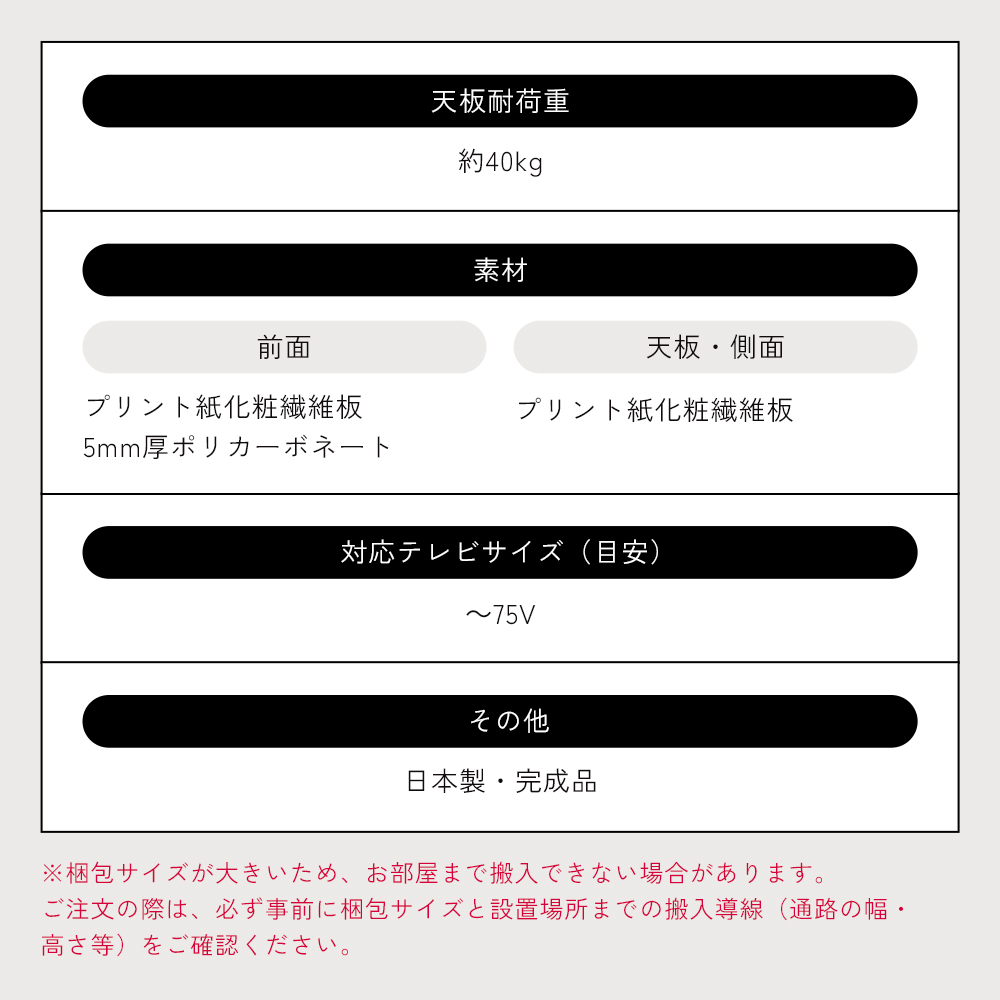 日本製×完成品の丁寧な作りのテレビ台。分類収納できる2杯の引き出しと扉付きの収納。国内の職人と収納性・配線しやすさにこだわって開発した、組立不要ですぐに使える完成品テレビボードです!収納機能が詰まった日本製完成品テレビ台”高品質”かつ”便利な収納機能性”はディノスのテレビ台がこだわっているポイント!国内の職人が一つひとつ丁寧に作り上げたこのテレビ台は、到着したその日からすぐに使える完成品です。忙しい日常の中でも、新しい生活をスムーズにスタートできます。分類収納できる2杯の引き出しで整理上手に高さ内寸15.5cmの中央引き出しにはDVDやブルーレイディスクなどの小物を収納するのに最適。高さ内寸30.5cmの左引き出しには子供のおもちゃやペット用品など、かさばるものをまとめて収納できます。リビングの整頓が簡単に実現します。熱がこもらない背面オープンの扉収納扉付きの右収納部は背面がオープンになっているため熱がこもらず、ゲーム機やルーターなどの電子機器の収納に最適。配線を綺麗にまとめる工夫背面には電源タップの収納部があり、デッキ収納部からも扉付き収納部からも配線をすっきりとまとめることができるので、掃除もしやすく見た目も綺麗です。ぴったり壁付けしても配線出来る天板が後方にやや伸びている形状の為、壁付けしてもサイドのすき間からコード類を外に逃がせます。各サイズテレビ設置イメージ55インチなど、大型テレビにも対応するサイズです。各収納部内寸DVD、ブルーレイ、デッキ、ルーター、ゲーム機等テレビ周りの収納物や、印鑑、書類、子供用品、ペット用品などリビング小物もまとめて収納できます。