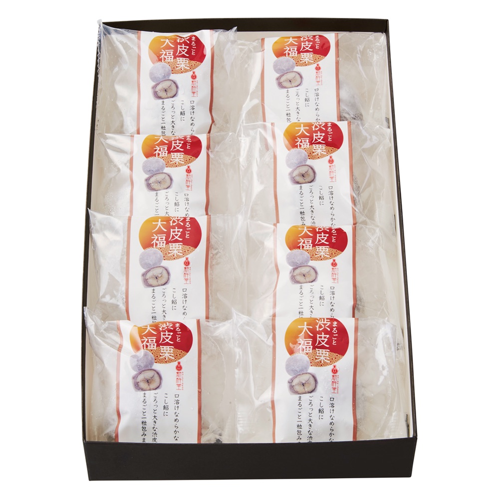 大粒の渋皮栗をまるごと。なめらかなこし餡の大福です。栗本来の甘さと風味を味わう老舗「新杵堂」の上品な大福です。厳選した大粒栗を渋皮ごとじっくり煮込み、まるごと一粒をこし餡とともに羽二重餅で包みました。贈り物にもおすすめです。