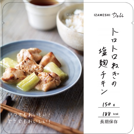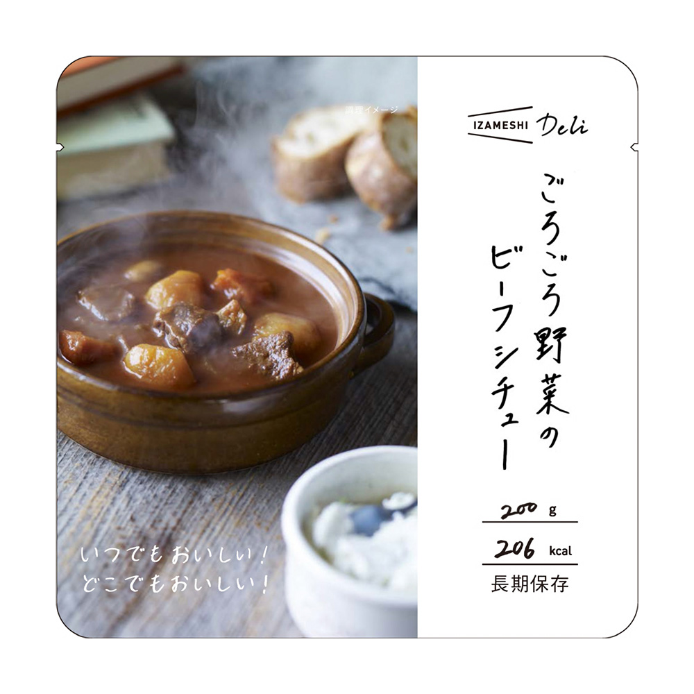 いつでも、どこでもおいしく食べられる保存食です。封を開けるだけですぐに召し上がれます。災害時の備えとしてだけでなく、普段の食事でもおいしく食べられることにこだわったメニューです。「IZAMESHI Deli」はこだわりの具材がうれしい、ひと手間かけた一品です。【ごろごろ野菜のビーフシチュー】赤身の牛肉を赤ワインとデミグラスソースで煮込み、さらっとしたシチューに仕上げました。【りんごが決め手の生姜焼き】すりおろしりんごとたまねぎの甘みが豚肉にしみこみ、生姜の香りが効いた後味さっぱりの生姜焼きに仕上げました。【トロトロねぎの塩麹チキン】うまみたっぷりのグリルチキンと存在感のあるトロトロ長ねぎを塩麹でさっぱりとしたおいしさに仕上げました。