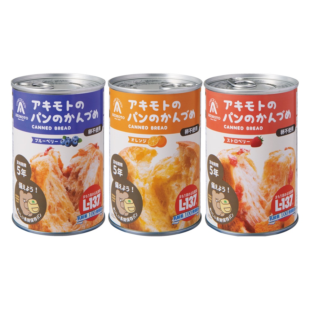 缶詰のパンとは思えないふわふわ食感に感動します!震災支援などを続けるアキモトが開発。缶の中で生地を発酵させ、焼き上げているので、焼きたてのような美味しさが長持ち。常温で5年保存可能。