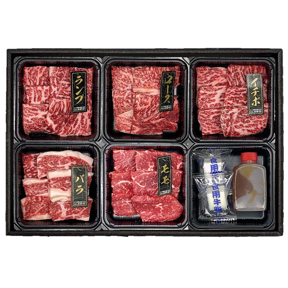 お届けパッケージ。牛脂とタレ付きです!赤身の旨身が強さ、脂の口どけの良さをお楽しみください