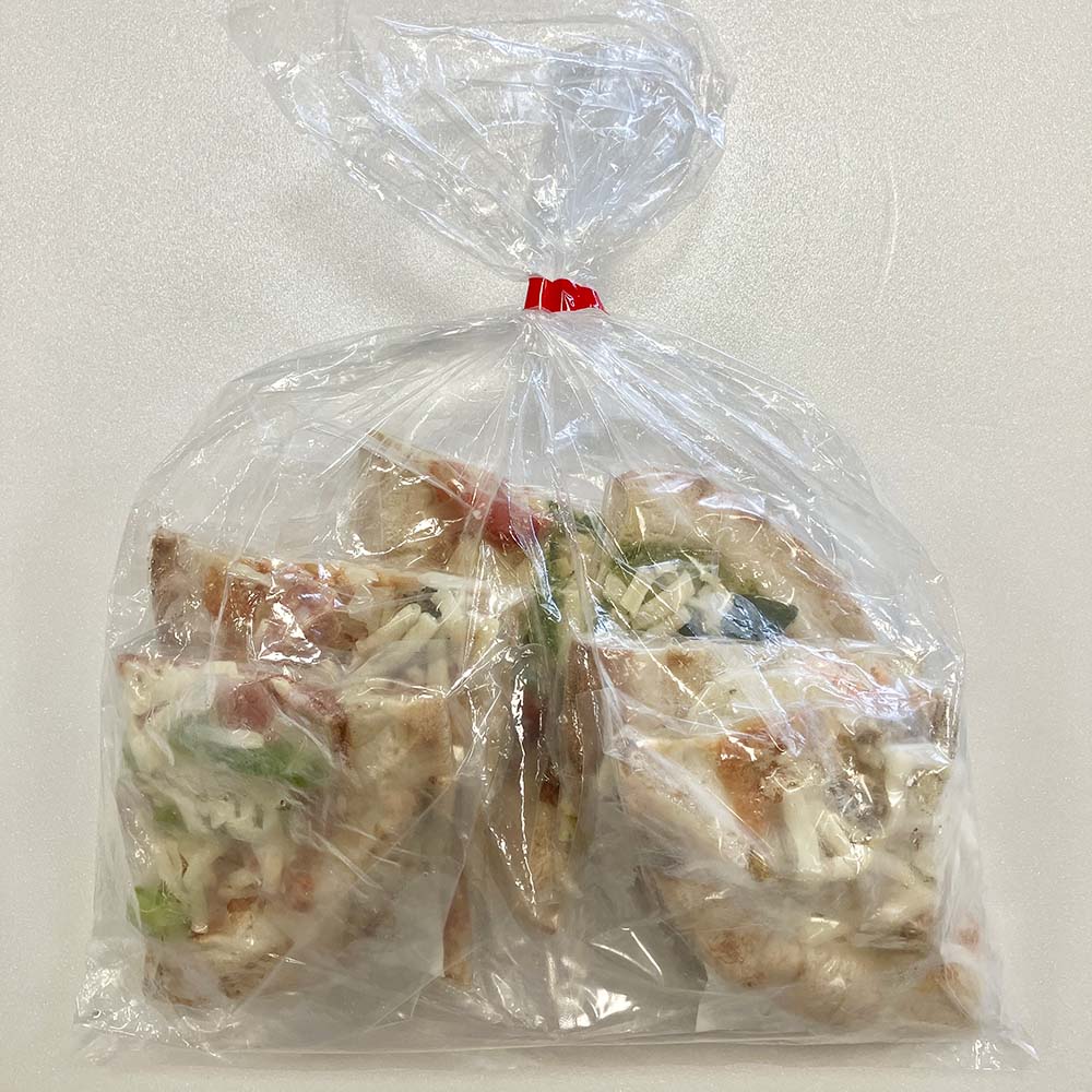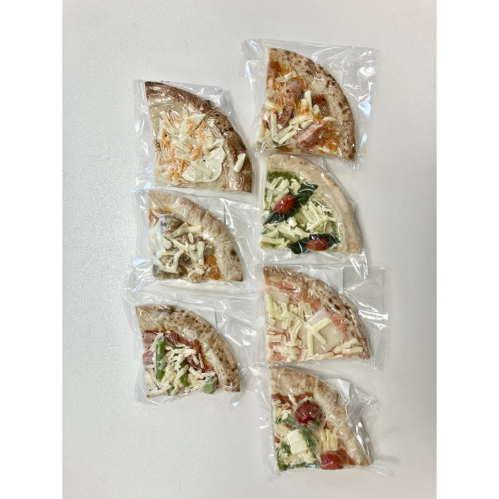 1/4にカットされたピザが7種類入っているので朝食やランチにぴったり♪1/4にカットされたピザが7種類も!味わいはアスパラとベーコンピザ、ジェノベーゼ、5種のチーズ、ヤギシタ旨辛チョリソー、たっぷりチーズのマルゲリータ、海の幸たっぷり、博多めんたいくりーむ。カットされているから朝食やランチ、小腹の空いた時にも最適。