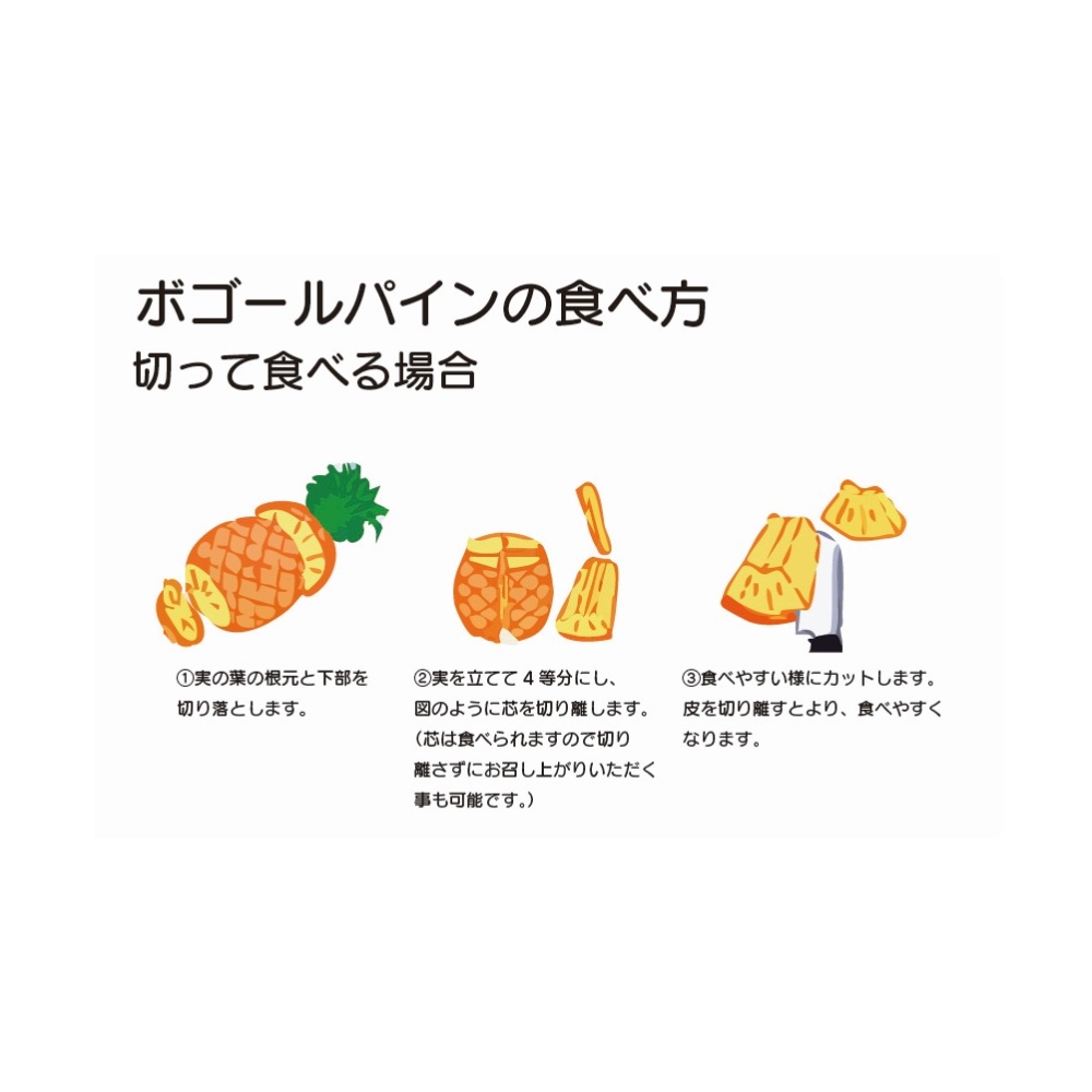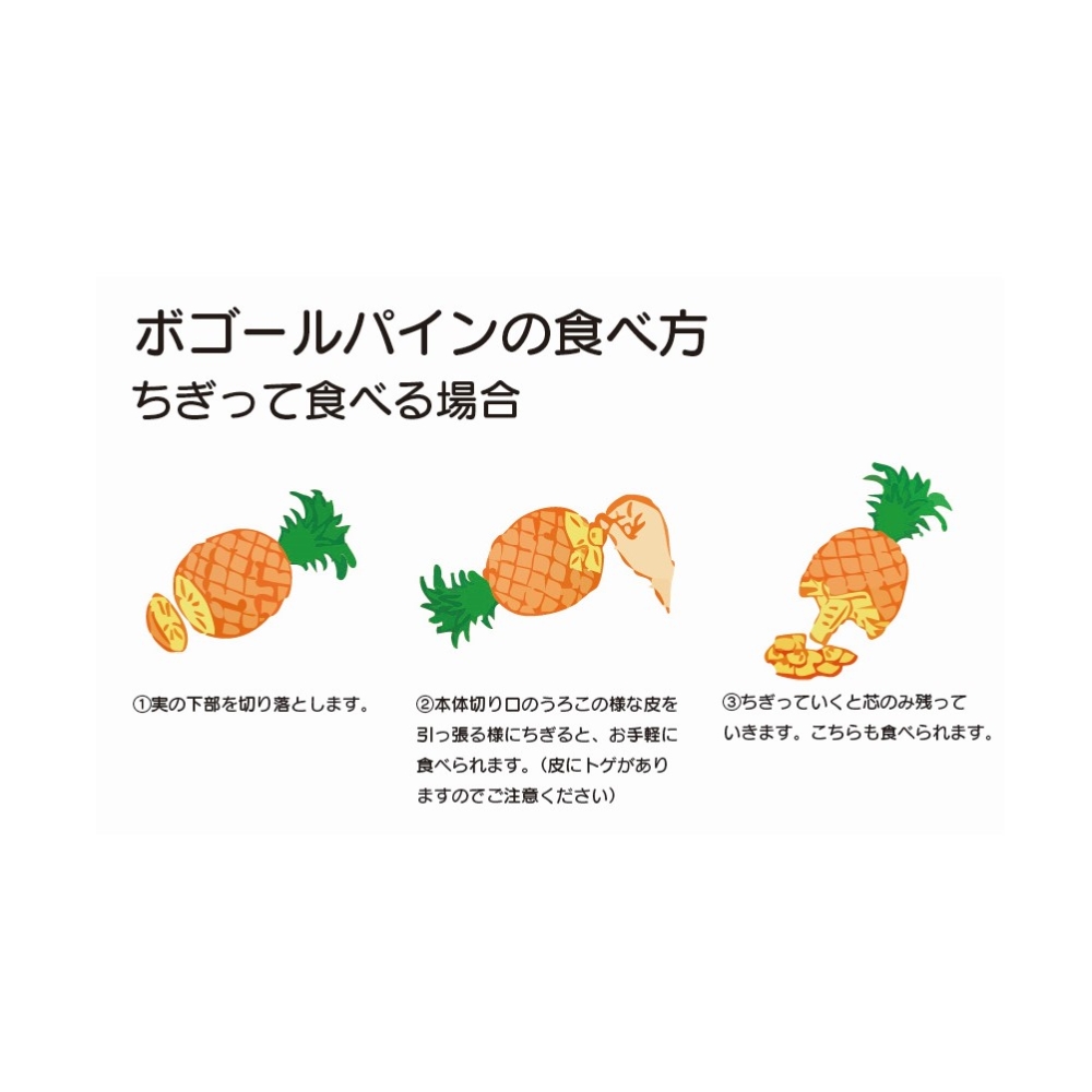 果皮を手でちぎって食べられることから「スナックパイン」とも称される品種酸味が少なく甘みが強い、輸入パインとは異なる味わいをお楽しみください♪※お申込締切は6月9日(封書は6月9日必着)となります。※6月19〜20日頃のお届け■指先でちぎって、芯まで味わう新習慣「ボゴールパイン」は、その食べやすさから別名「スナックパイン」とも呼ばれる、沖縄県が誇る人気品種です。輸入パインに比べて小ぶりな実には、驚くほど凝縮された甘みが詰まっています。最大の特徴は、皮を指でちぎってそのまま食べられる手軽さ。さらに、通常は捨ててしまう「芯」までサクサクと美味しく食べられるため、果実の恵みを余すことなく堪能いただけます。■国産パイナップルの産地、沖縄県からお届け!沖縄本島の一部地域と石垣島で盛んに栽培される国産パイナップル。完熟を見極めて収穫されたその一粒は、まるで天然のスイーツ。酸味が少なく、お子様からご年配の方まで夢中になる、優しく力強い味わいです。■お召し上がり方【ちぎって食べる場合】〜スナックパインならでは〜1.実の下部(お尻部分)を切り落とします。2.切り口のうろこのような皮を引っ張るようにちぎると、お手軽にお召し上がりいただけます。※皮にトゲがありますので、指先を傷つけないようご注意ください。3.ちぎっていくと芯のみ残ります(こちらもお召し上がりいただけます)。【切って食べる場合】〜お皿に盛り付ける際や、一度にたっぷり頬張りたいときにおすすめ〜1.実の葉の根元と下部を切り落とします。2.身を立てて4等分にして、芯を切り離します。 ※芯ごと、切り離さずにお召し上がりいただくことも可能です。3.食べやすいようにカットします。■保存方法【丸ごとの場合】新聞紙等で包んで、果実を立てて冷蔵庫(野菜室)で保存してください。