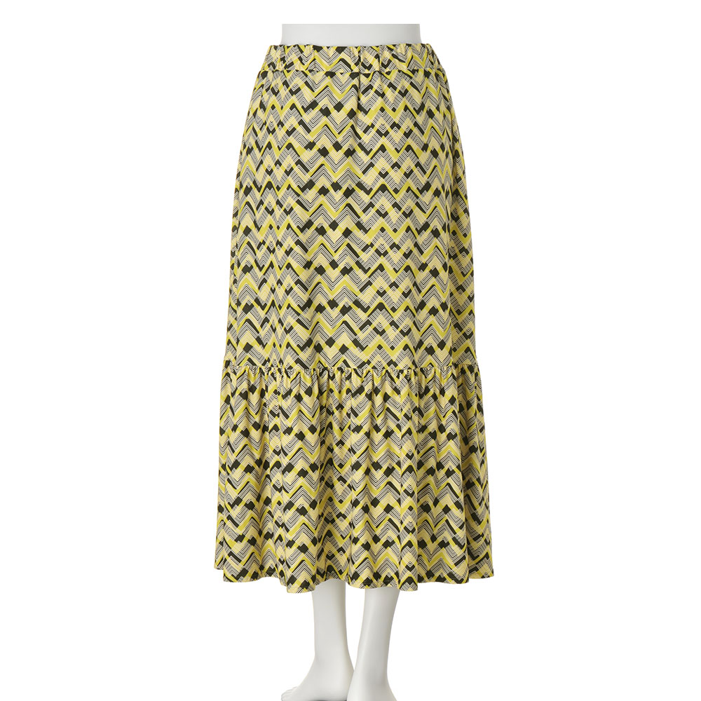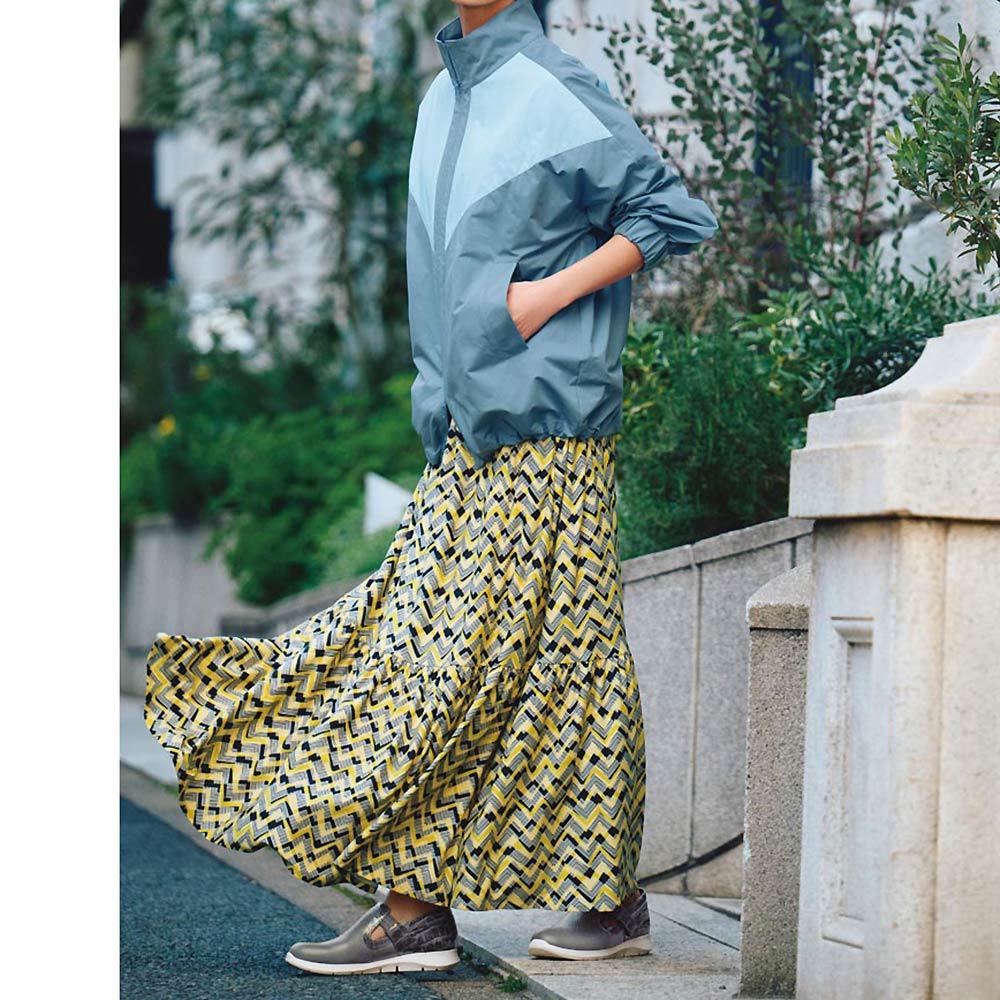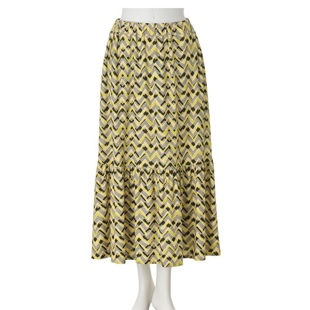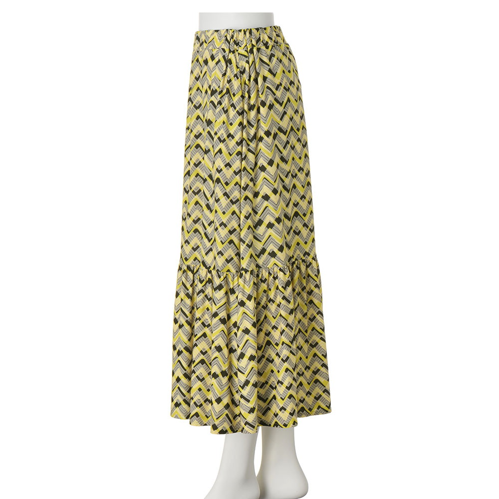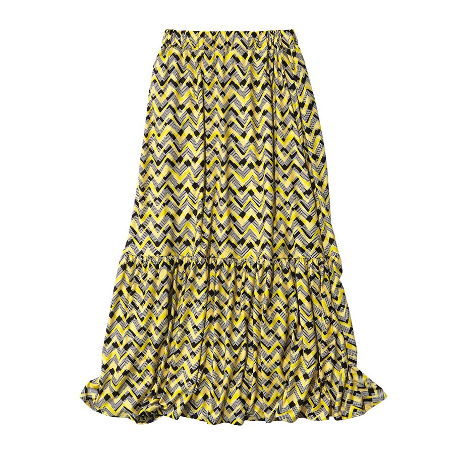 これぞスポーティ×フェミニンのお手本!イエローベースの幾何学柄素材は、フランス「F.T.F.」社のもの。生地を贅沢に使ったボリュームのあるティアードデザインですが、滑らかで落ち感のあるジャージー素材なので、広がりすぎず着心地も軽やか。ウエストはゴム仕様のプルオンタイプで、動きやすいストレッチ性のある裏地をプラスしました。