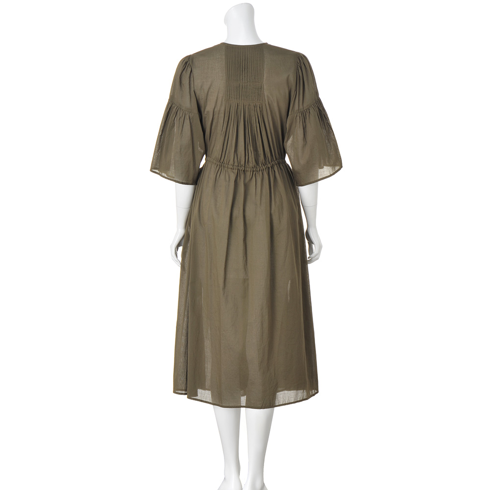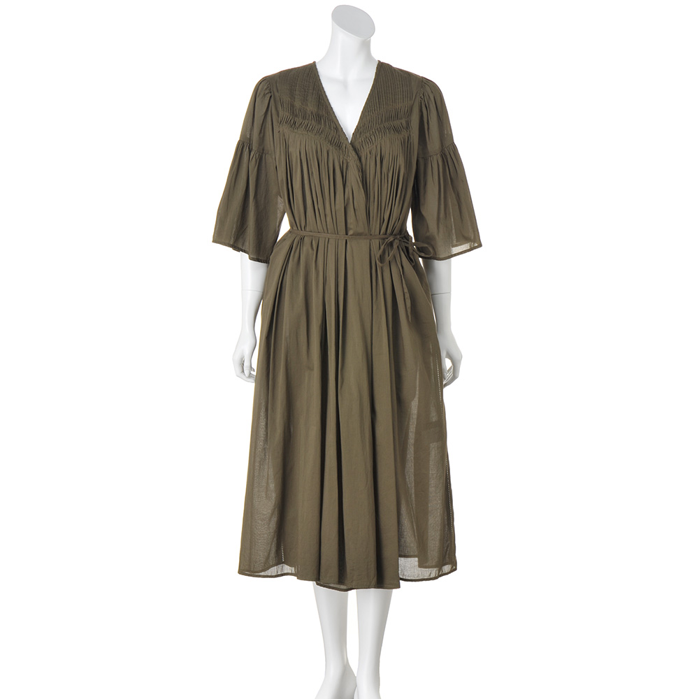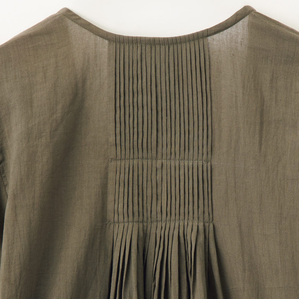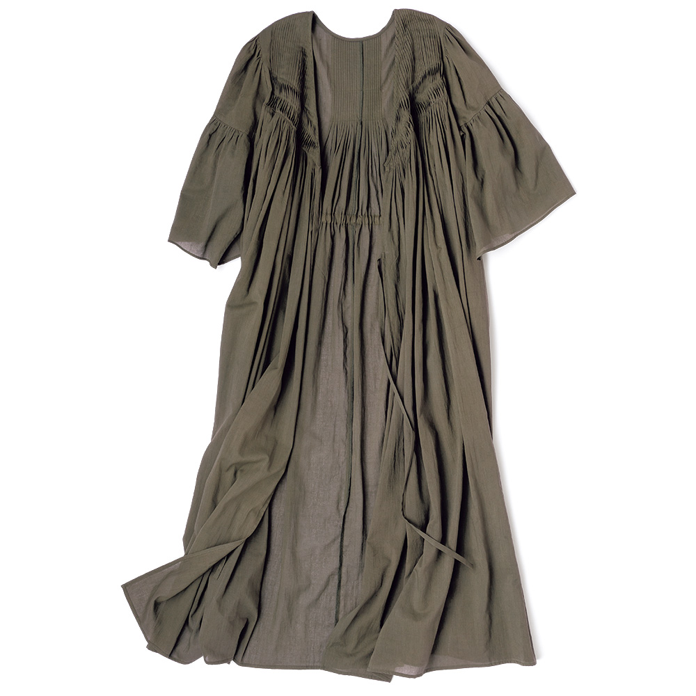 世界を魅了する インドの手仕事太古の昔から今なお続く、インドの“布づくり”。世界の至宝といえる美しい手仕事が誕生する現場に立ち会いました。クチュールの高みに導くピンタックの美技素肌に優しく爽やかな着心地のコットンボイル。そこに幾層もの細かなピンタックを装飾するシンプルな手法で、クチュール感溢れるワンピースを作りました。シンプルと言っても、1ヒダごとの間隔で狂いなくミシンを掛け、前身頃の肩から胸、後ろ身頃のセンターまで飾り付けるのは大変な作業。高度な技を要するため、限られた職人にしか為せない意匠だと言います。それだけに出来栄えは格別。タックを捻る技巧、脇線のハシゴレースで緩急ある表情を加え、タックから放つドレープが優雅なフレアーを盛り上げています。内紐が付いたカシュクールデザインだから、リボンベルトを解いてさらっと羽織っても素敵。≫ POINT後ろにも繊細なタックを飾り、前を開ければコート風羽織に。