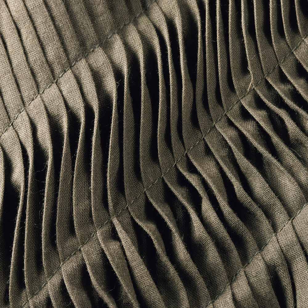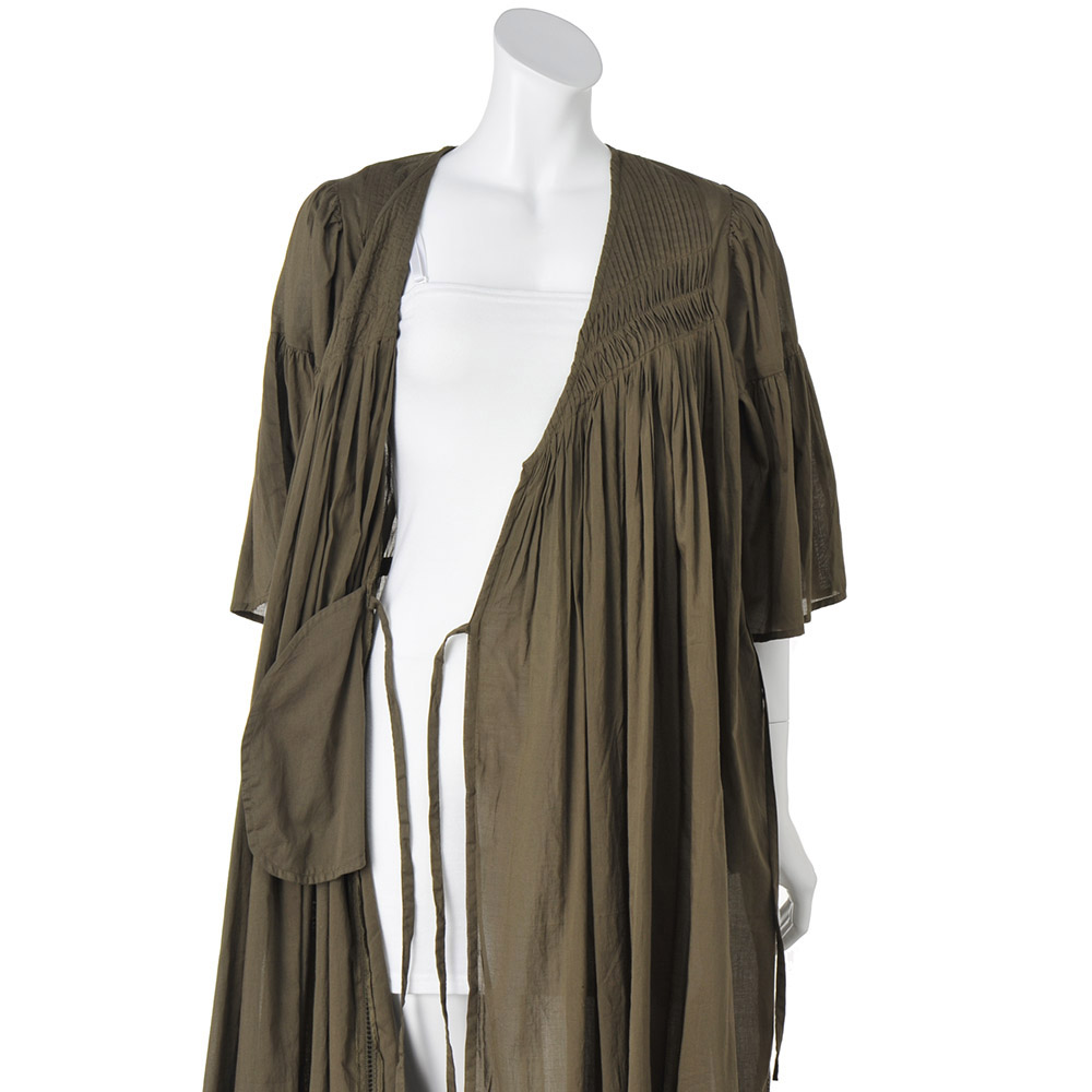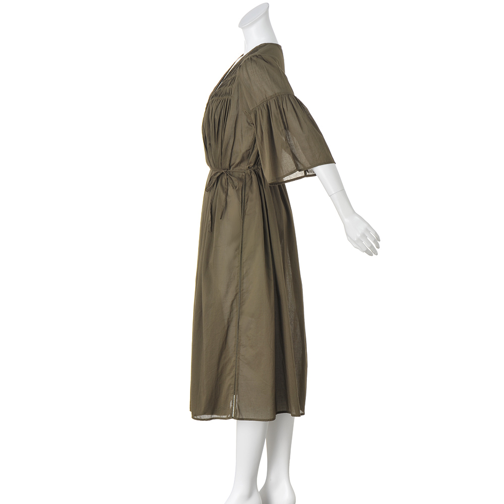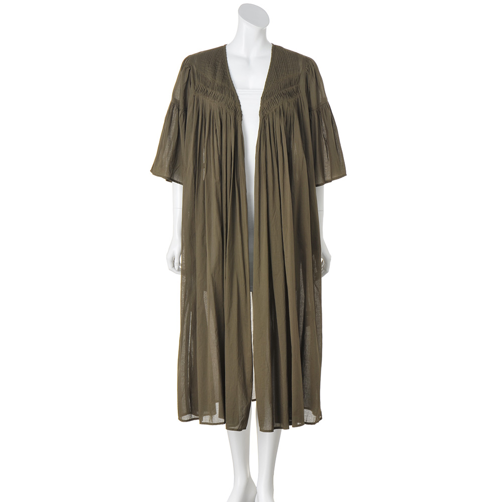 世界を魅了する インドの手仕事太古の昔から今なお続く、インドの“布づくり”。世界の至宝といえる美しい手仕事が誕生する現場に立ち会いました。クチュールの高みに導くピンタックの美技素肌に優しく爽やかな着心地のコットンボイル。そこに幾層もの細かなピンタックを装飾するシンプルな手法で、クチュール感溢れるワンピースを作りました。シンプルと言っても、1ヒダごとの間隔で狂いなくミシンを掛け、前身頃の肩から胸、後ろ身頃のセンターまで飾り付けるのは大変な作業。高度な技を要するため、限られた職人にしか為せない意匠だと言います。それだけに出来栄えは格別。タックを捻る技巧、脇線のハシゴレースで緩急ある表情を加え、タックから放つドレープが優雅なフレアーを盛り上げています。内紐が付いたカシュクールデザインだから、リボンベルトを解いてさらっと羽織っても素敵。≫ POINT後ろにも繊細なタックを飾り、前を開ければコート風羽織に。