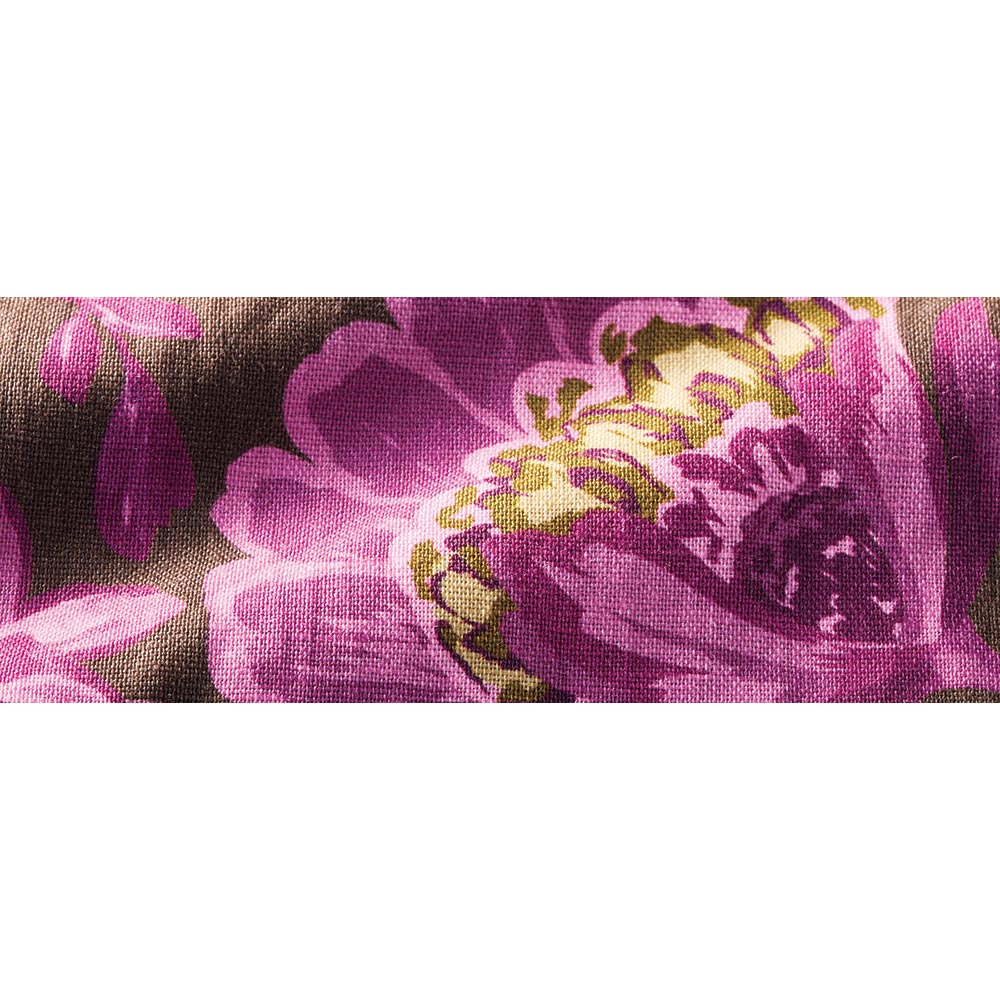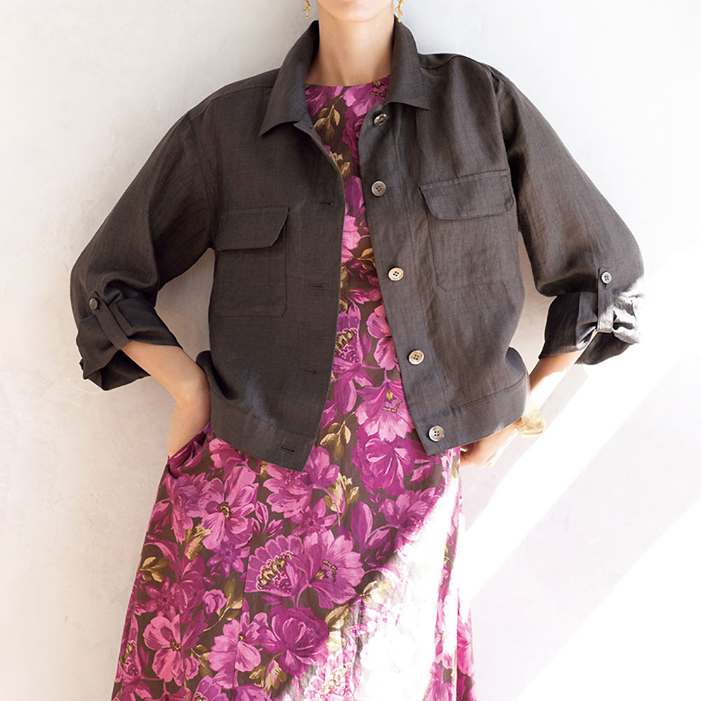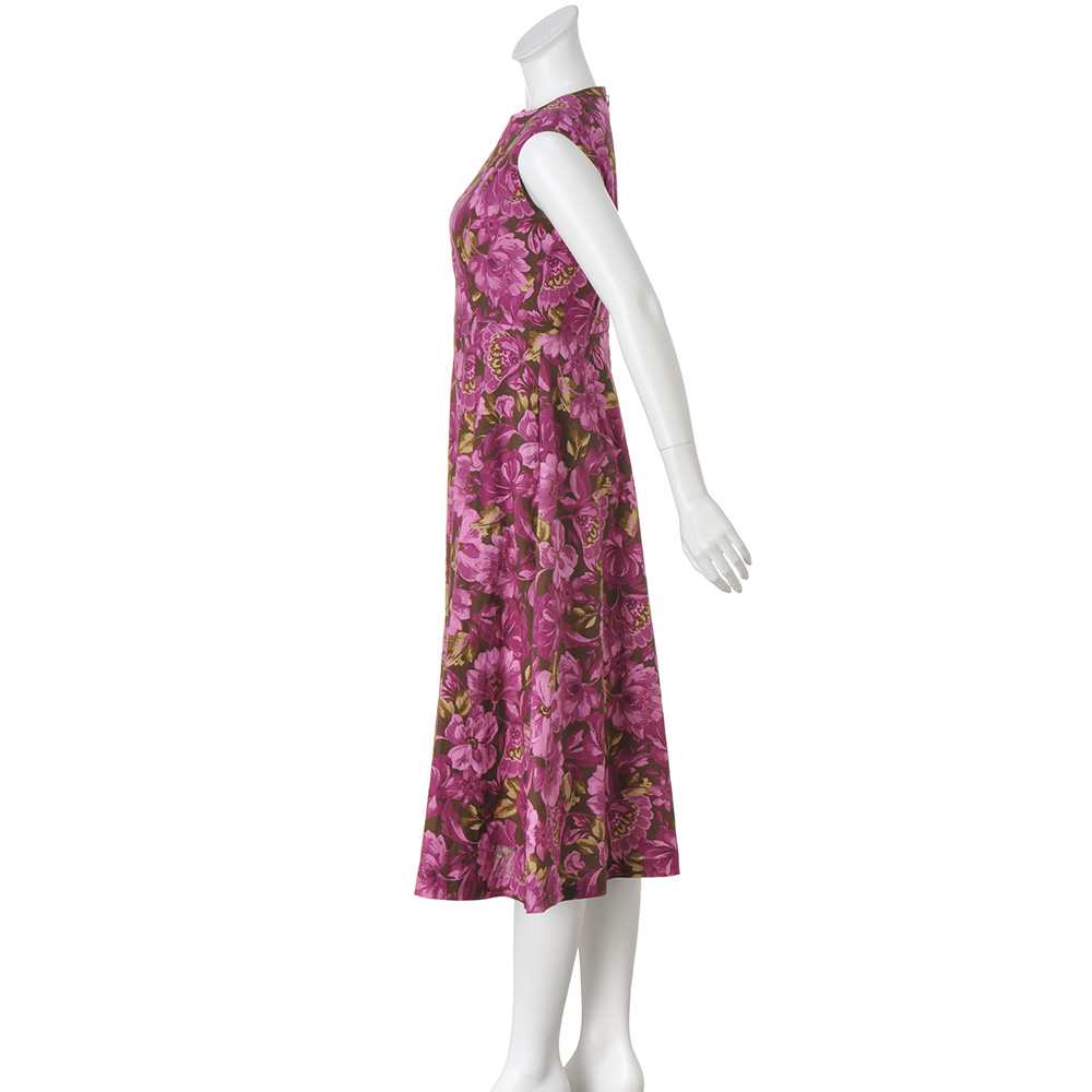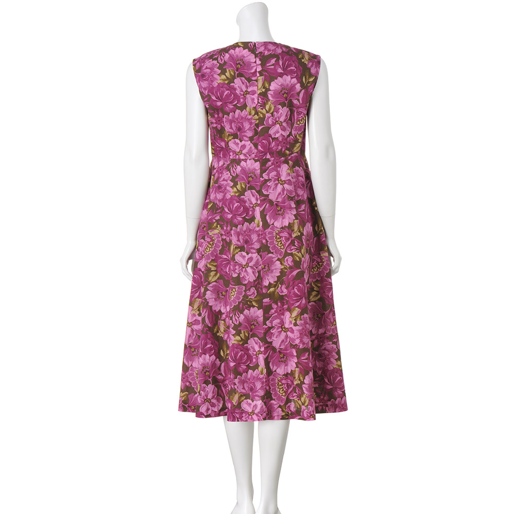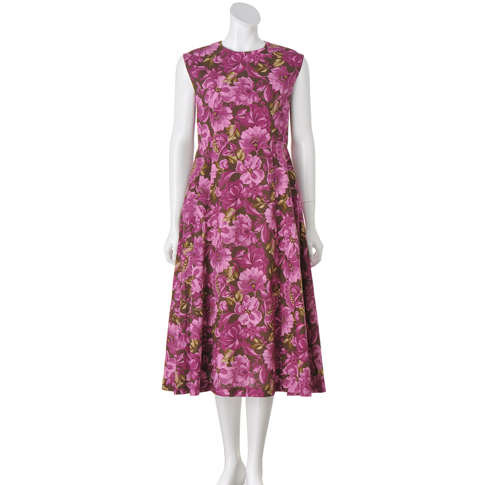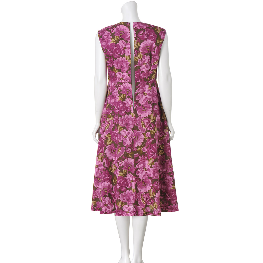 Linen Style心地よく、美しく。季節をつなぐ「リネン」の魅力。意志ある女性に似合う大人のロマンティックパープルピンクの甘美なフラワーは、美しいプリント技術とカラーリングに定評のあるイタリアのメーカーに別注したDAMAコレクションオリジナル生地。ブラウンを背景にプリントしているため、大輪の模様もシックな印象です。素材はリネンのナチュラルな風合いを湛えたコットンミックス。ウエストを絞り過ぎないフィット&フレアーを、パターンを駆使して凛とした表情に仕上げています。